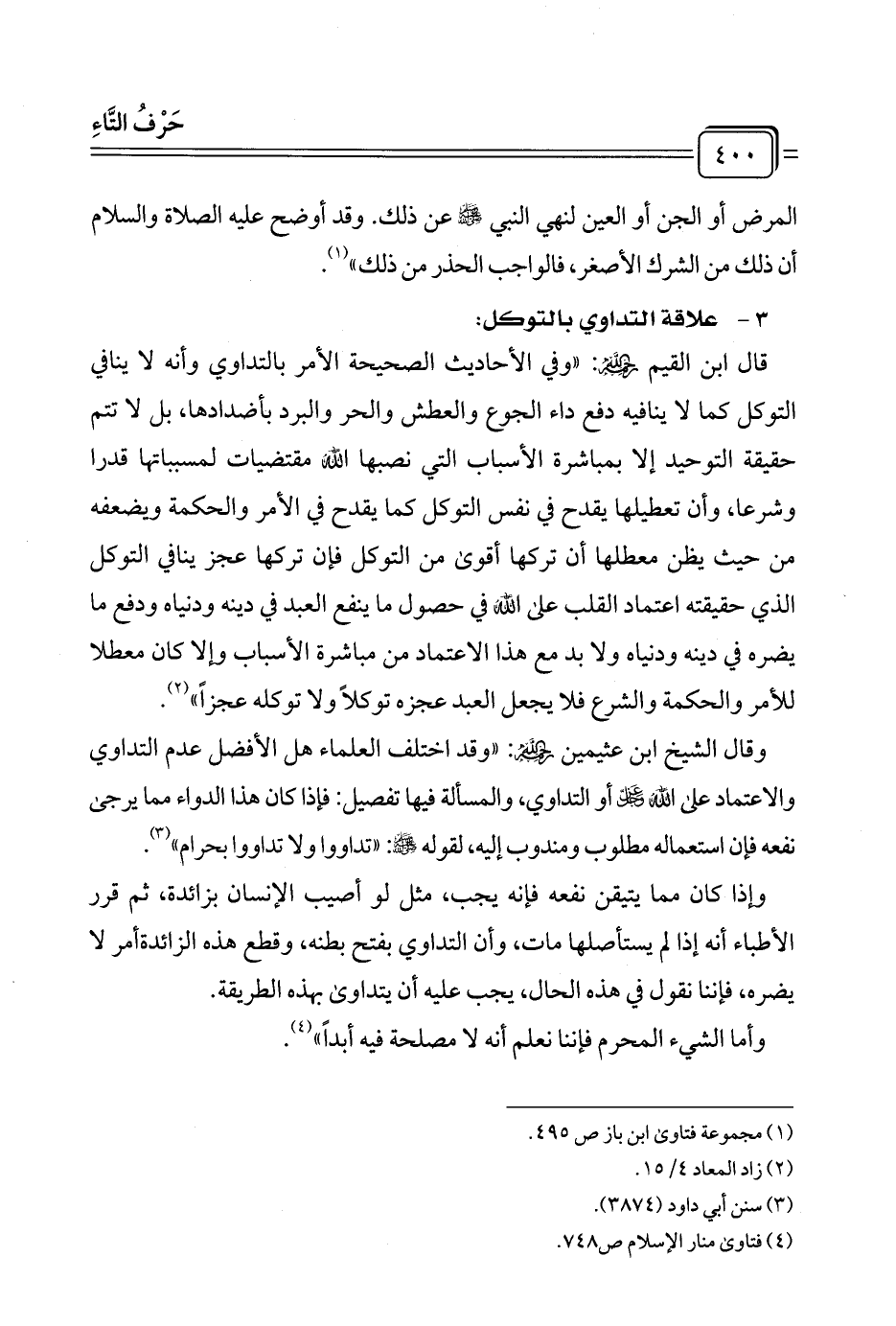وقال الشيخ ابن عثيمين -رحمه الله-: "وقد اختلف العلماء هل الأفضل عدم التداوي والاعتماد على الله -عز وجل- أو التداوي، والمسألة فيها تفصيل: فإذا كان هذا الدواء مما يرجى نفعه فإن استعماله مطلوب ومندوب إليه، لقوله -صلى الله عليه وسلم-: "تداووا ولا تداووا بحرام" (¬٣).