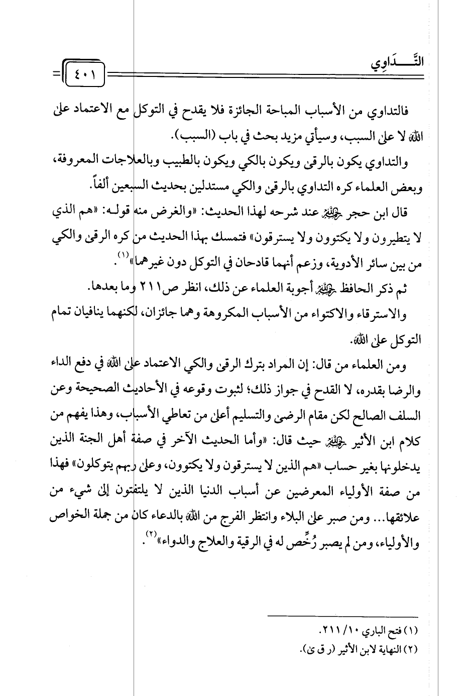 ومن العلماء من قال: إن المراد بترك الرقى والكي الاعتماد على الله في دفع الداء والرضا بقدره، لا القدح في جواز ذلك؛ لثبوت وقوعه في الأحاديث الصحيحة وعن السلف الصالح لكن مقام الرضى والتسليم أعلى من تعاطي الأسباب، وهذا يفهم من كلام ابن الأثير -رحمه الله- حيث قال: "وأما الحديث الآخر في صفة أهل الجنة الذين يدخلونها بغير حساب "هم الذين لا يسترقون ولا يكتوون، وعلى ربهم يتوكلون" فهذا من صفة الأولياء المعرضين عن أسباب الدنيا الذين لا يلتفتون إلى شيء من علائقها ... ومن صبر على البلاء وانتظر الفرج من الله بالدعاء كان من جملة الخواص والأولياء، ومن لم يصبر رُخِّص له في الرقية والعلاج والدواء" (¬٢).