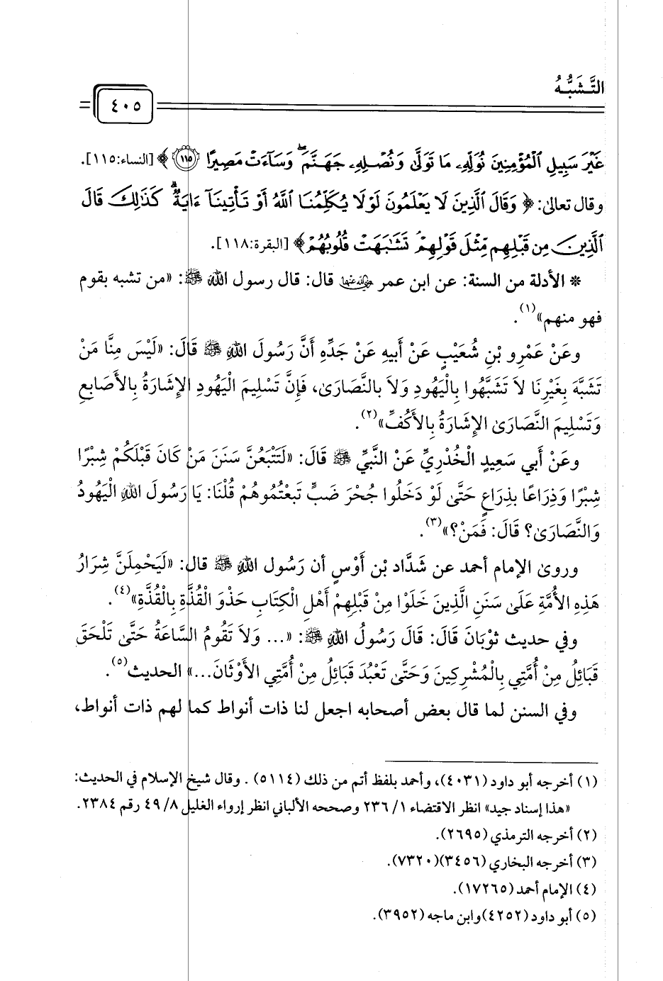 * الأدلة من السنة: عن ابن عمر -رضي الله عنهما- قال: قال رسول الله -صلى الله عليه وسلم-: "من تشبه بقوم فهو منهم" (¬١).