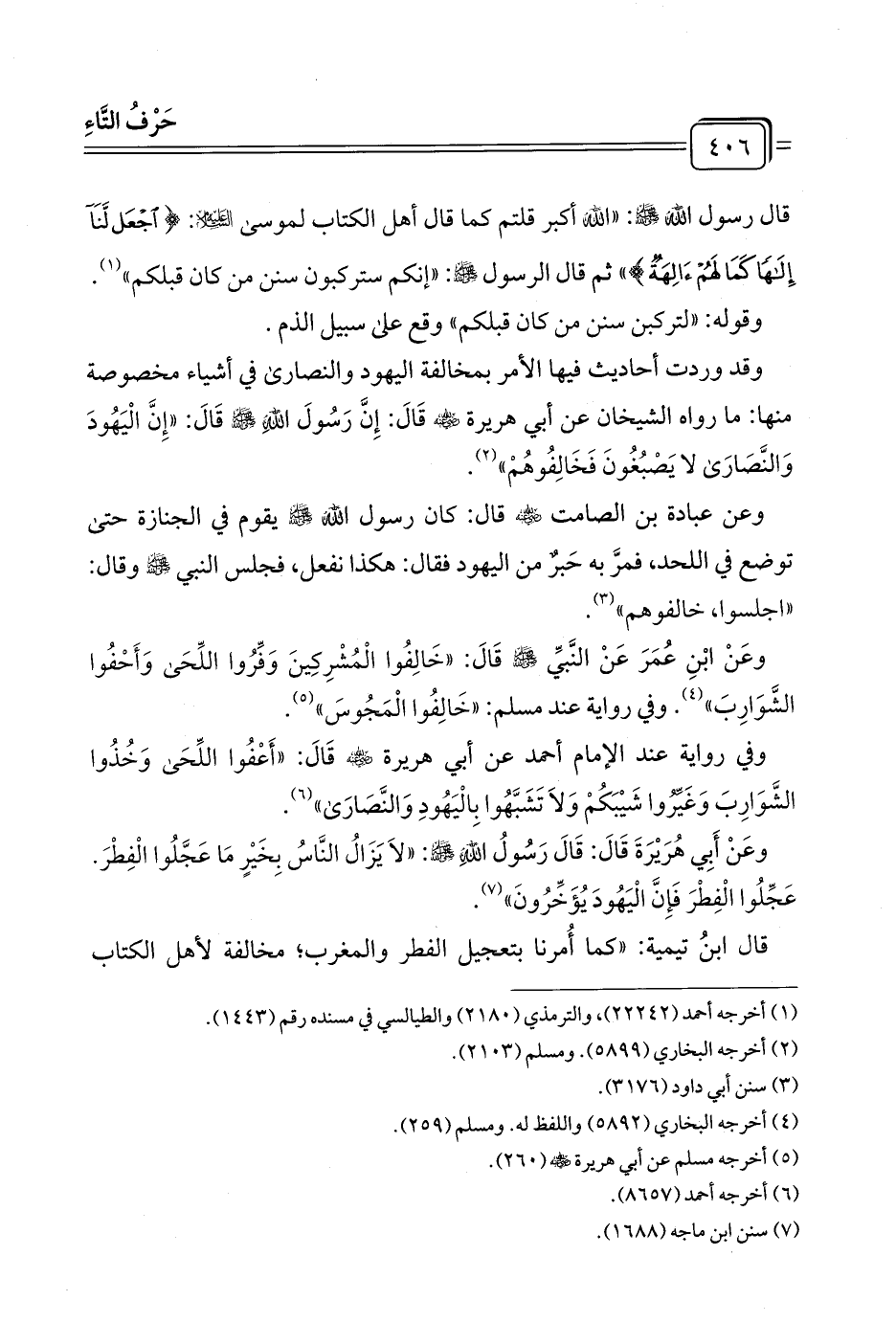وقد وردت أحاديث فيها الأمر بمخالفة اليهود والنصارى في أشياء مخصوصة منها: ما رواه الشيخان عن أبي هريرة -رضى الله عنه- قَالَ: إِنَّ رَسُولَ الله -صلى الله عليه وسلم- قَالَ: "إِنَّ الْيَهُودَ وَالنَّصَارَى لا يَصْبُغُونَ فَخَالِفُوهُمْ" (¬٢).