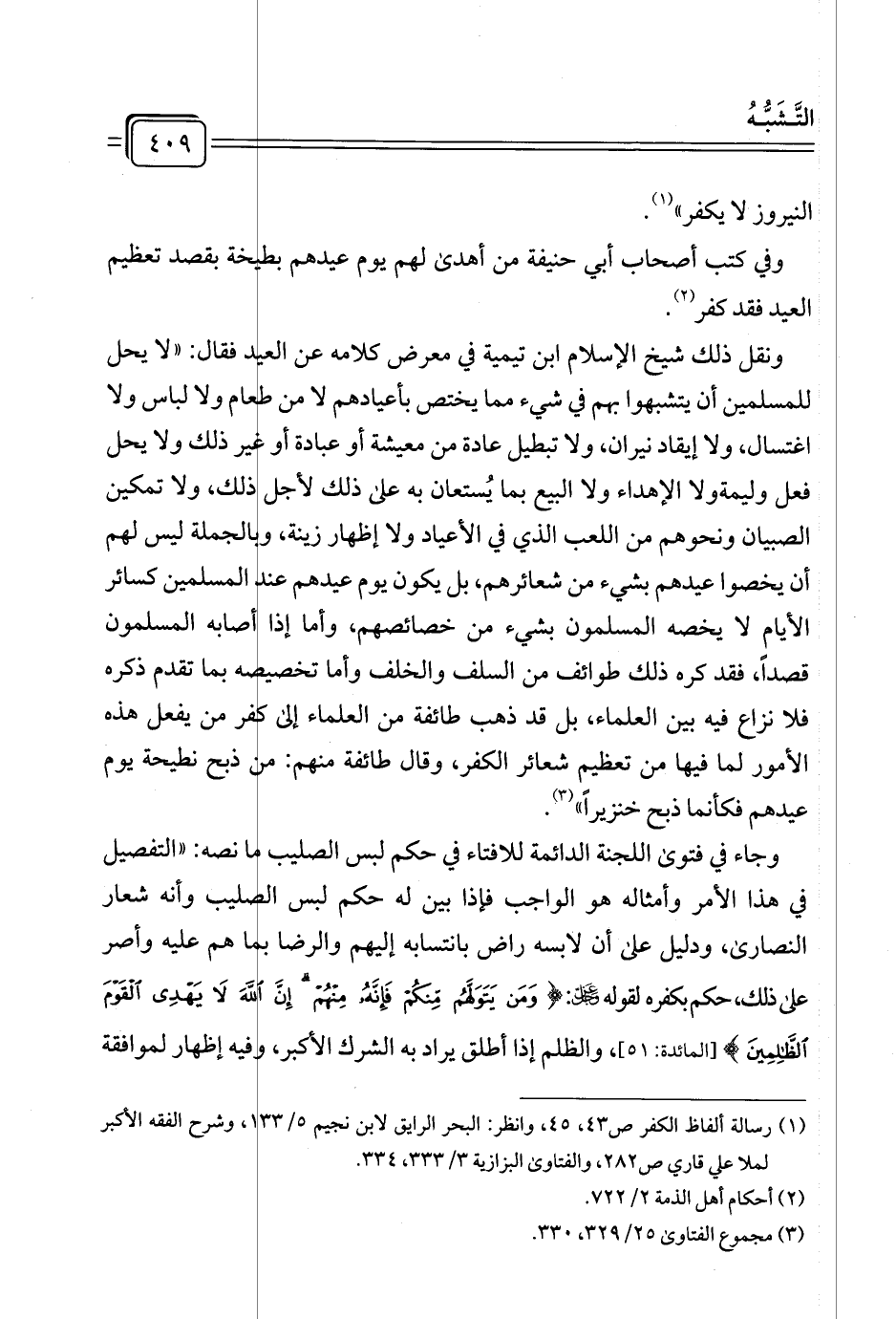 ونقل ذلك شيخ الإسلام ابن تيمية في معرض كلامه عن العيد فقال: "لا يحل للمسلمين أن يتشبهوا بهم في شيء مما يختص بأعيادهم لا من طعام ولا لباس ولا اغتسال، ولا إيقاد نيران، ولا تبطيل عادة من معيشة أو عبادة أو غير ذلك ولا يحل فعل وليمة ولا الإهداء ولا البيع بما يُستعان به على ذلك لأجل ذلك، ولا تمكين الصبيان ونحوهم من اللعب الذي في الأعياد ولا إظهار زينة، وبالجملة ليس لهم أن يخصوا عيدهم بشيء من شعائرهم، بل يكون يوم عيدهم عند المسلمين كسائر الأيام لا يخصه المسلمون بشيء من خصائصهم، وأما إذا أصابه المسلمون قصدًا، فقد كره ذلك طوائف من السلف والخلف وأما تخصيصه بما تقدم ذكره فلا نزاع فيه بين العلماء، بل قد ذهب طائفة من العلماء إلى كفر من يفعل هذه الأمور لما فيها من تعظيم شعائر الكفر، وقال طائفة منهم: من ذبح نطيحة يوم عيدهم فكأنما ذبح خنزيرًا" (¬٣).