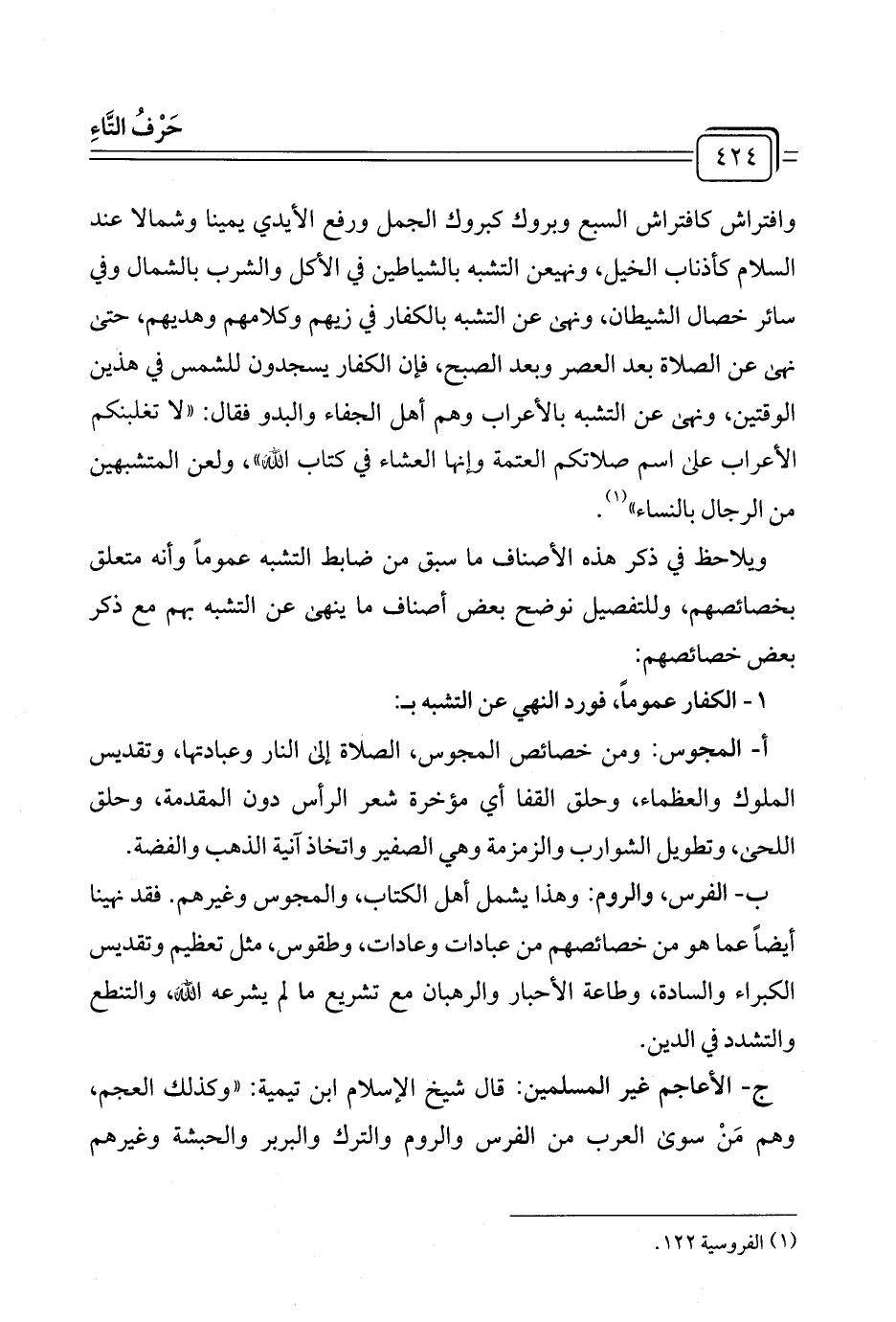 ب - الفرس، والروم: وهذا يشمل أهل الكتاب، والمجوس وغيرهم. فقد نهينا أيضًا عما هو من خصائصهم من عبادات وعادات، وطقوس، مثل تعظيم وتقديس الكبراء والسادة، وطاعة الأحبار والرهبان مع تشريع ما لم يشرعه الله، والتنطع والتشدد في الدين.