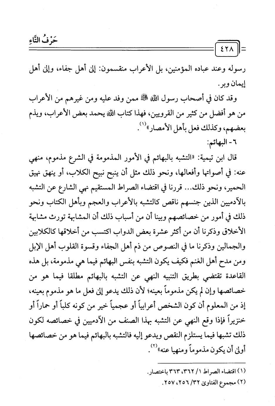 قال ابن تيمية: "التشبه بالبهائم في الأمور المذمومة في الشرع مذموم، منهي عنه: في أصواتها وأفعالها، ونحو ذلك مثل أن ينبح نبيح الكلاب، أو ينهق نهيق الحمير، ونحو ذلك ... قررنا في اقتضاء الصراط المستقيم نهي الشارع عن التشبه بالآدميين الذين جنسهم ناقص كالتشبه بالأعراب والعجم وبأهل الكتاب ونحو ذلك في أمور من خصائصهم وبينا أن من أسباب ذلك أن المشابهة تورث مشابهة الأخلاق وذكرنا أن من أكثر عشرة بعض الدواب اكتسب من أخلاقها كالكلابين والجمالين وذكرنا ما في النصوص من ذم أهل الجفاء وقسوة القلوب أهل الإبل ومن مدح أهل الغنم فكيف يكون التشبه بنفس البهائم فيما هي مذمومة، بل هذه القاعدة تقتضي بطريق التنبيه النهي عن التشبه بالبهائم مطلقا فيما هو من خصائصها وإن لم يكن مذمومًا بعينه؛ لأن ذلك يدعو إلى فعل ما هو مذموم بعينه، إذ من المعلوم أن كون الشخص أعرابيًا أو عجميًا خير من كونه كلبًا أو حمارًا أو خنزيرًا فإذا وقع النهي عن التشبه بهذا الصنف من الآدميين في خصائصه لكون ذلك تشبها فيما يستلزم النقص ويدعو إليه فالتشبه بالبهائم فيما هو من خصائصها أولى أن يكون مذمومًا ومنهيا عنه" (¬٢).