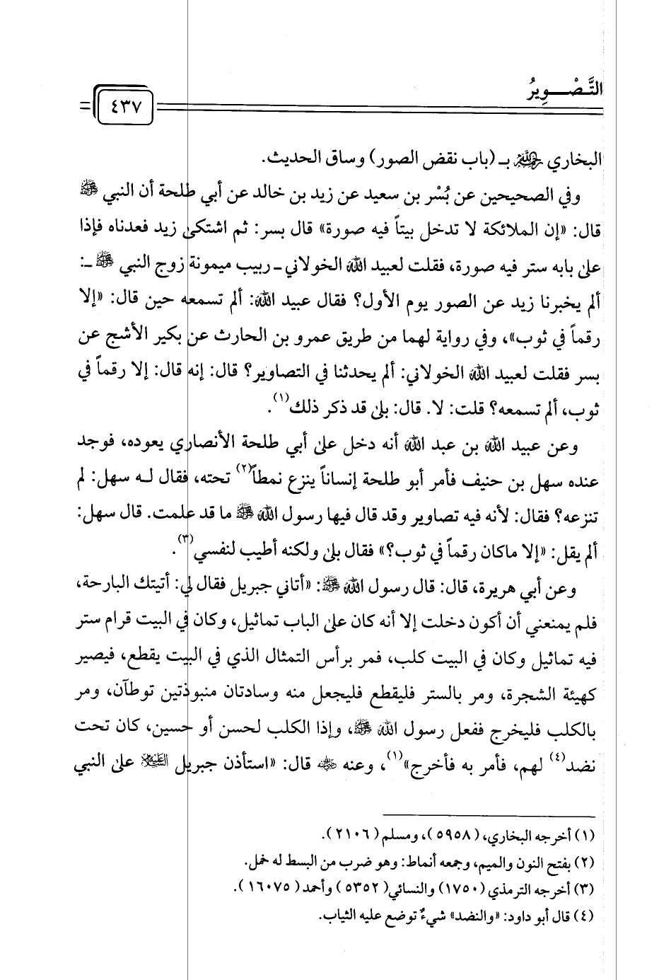 وعن عبيد الله بن عبد الله أنه دخل على أبي طلحة الأنصاي يعوده، فوجد عنده سهل بن حنيف فأمر أبو طلحة إنسانًا ينزع نمطًا (¬٢) تحته، فقال له سهل: لم تنزعه؟ فقال: لأنه فيه تصاوير وقد قال فيها رسول الله -صلى الله عليه وسلم- ما قد علمت. قال سهل: ألم يقل: "إلا ما كان رقمًا في ثوب؟ " فقال بلى ولكنه أطيب لنفسي (¬٣).