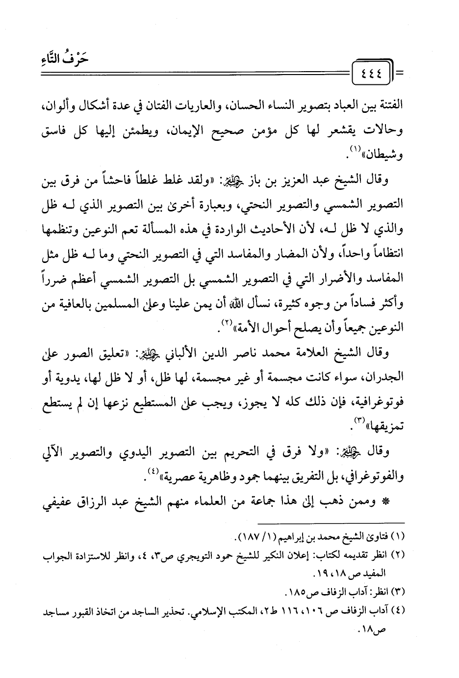 وقال الشيخ عبد العزيز بن باز -رحمه الله-: "ولقد غلط غلطًا فاحشًا من فرق بين التصوير الشمسي والتصوير النحتي، وبعبارة أخرى بين التصوير الذي له ظل والذي لا ظل له، لأن الأحاديث الواردة في هذه المسألة تعم النوعين وتنظمها انتظامًا واحدًا، ولأن المضار والمفاسد التي في التصوير النحتي وما له ظل مثل المفاسد والأضرار التي في التصوير الشمسي بل التصوير الشمسي أعظم ضررًا وأكثر فسادًا من وجوه كثيرة، نسأل الله أن يمن علينا وعلى المسلمين بالعافية من النوعين جميعًا وأن يصلح أحوال الأمة" (¬٢).