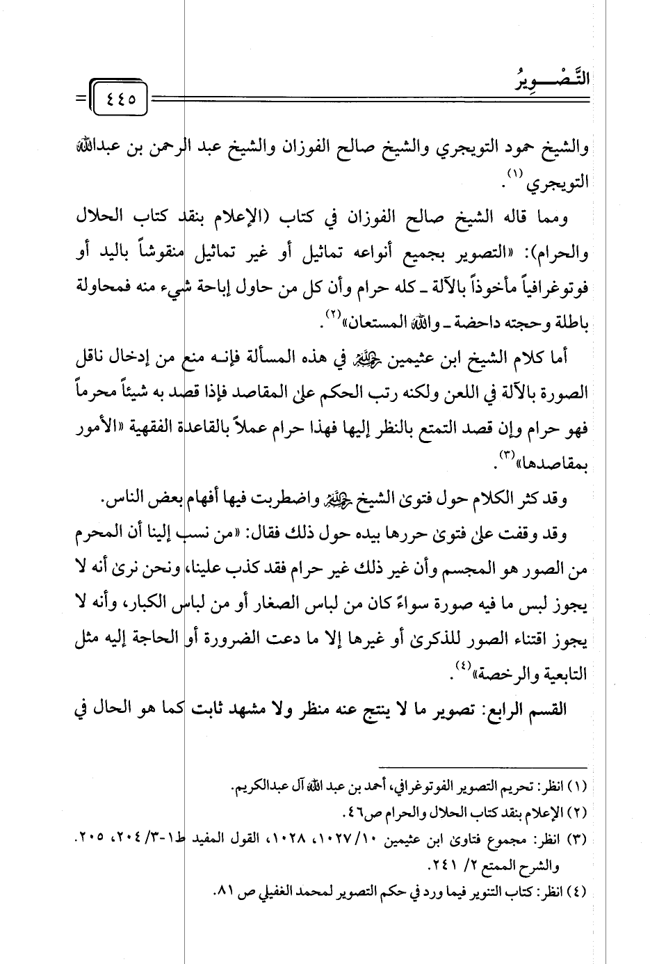ومما قاله الشيخ صالح الفوزان في كتاب (الإعلام بنقد كتاب الحلال والحرام): "التصوير بجميع أنواعه تماثيل أو غير تماثيل منقوشًا باليد أو فوتوغرافيًا مأخوذًا بالآلة -كله حرام وأن كل من حاول إباحة شيء منه فمحاولة باطلة وحجته داحضة- والله المستعان" (¬٢).