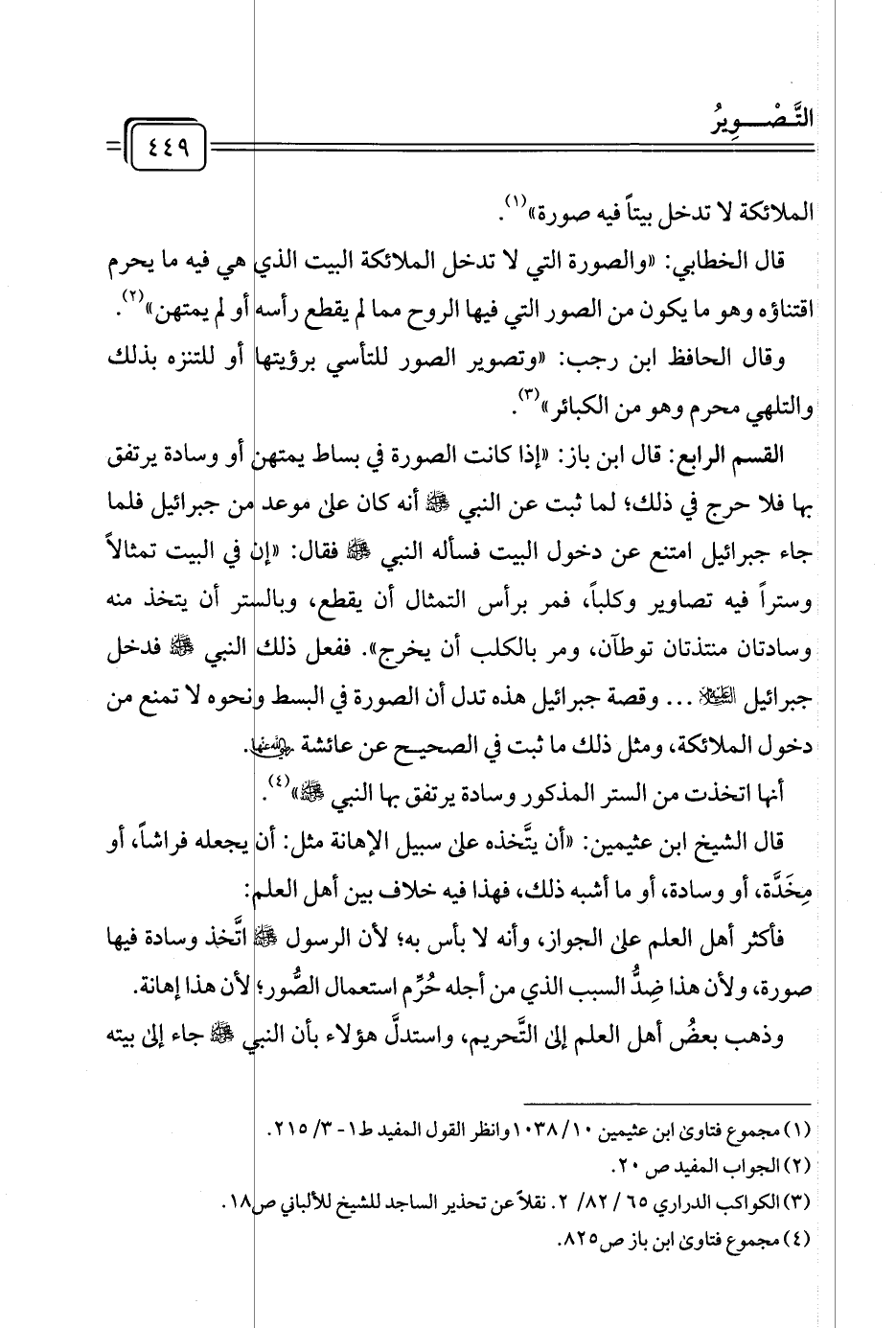 القسم الرابع: قال ابن باز: "إذا كانت الصورة في بساط يمتهن أو وسادة يرتفق بها فلا حرج في ذلك؛ لما ثبت عن النبي -صلى الله عليه وسلم- أنه كان على موعد من جبرائيل فلما جاء جبرائيل امتنع عن دخول البيت فسأله النبي -صلى الله عليه وسلم- فقال: "إن في البيت تمثالًا وسترًا فيه تصاوير وكلبًا، فمر برأس التمثال أن يقطع، وبالستر أن يتخذ منه وسادتان منتذتان توطآن، ومر بالكلب أن يخرج". ففعل ذلك النبي -صلى الله عليه وسلم- فدخل جبرائيل -عليه السلام- ... وقصة جبرائيل هذه تدل أن الصورة في البسط ونحوه لا تمنع من دخول الملائكة، ومثل ذلك ما ثبت في الصحيح عن عائشة -رضي الله عنها-.