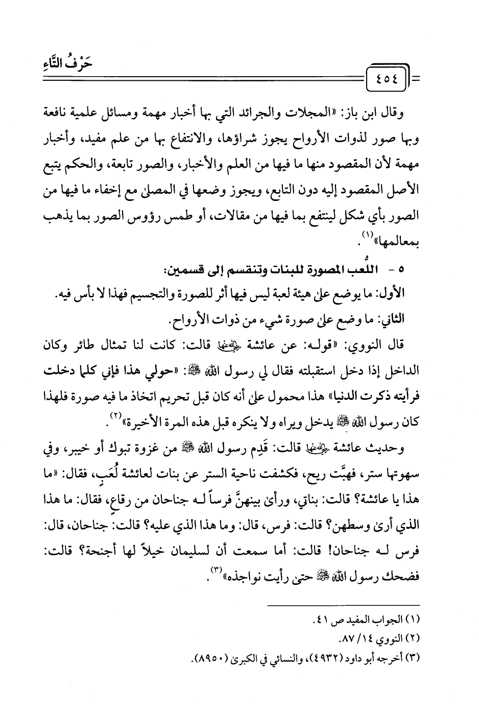 وحديث عائشة -رضي الله عنها- قالت: قَدِم رسول الله -صلى الله عليه وسلم- من غزوة تبوك أو خيبر، وفي سهوتها ستر، فهبَّت ريح، فكشفت ناحية الستر عن بنات لعائشة لُعَبٍ، فقال: "ما هذا يا عائشة؟ قالت: بناتي، ورأى بينهنَّ فرسًا له جناحان من رقاعٍ، فقال: ما هذا الذي أرى وسطهن؟ قالت: فرس، قال: وما هذا الذي عليه؟ قالت: جناحان، قال: فرس له جناحان! قالت: أما سمعت أن لسليمان خيلًا لها أجنحة؟ قالت: فضحك رسول الله -صلى الله عليه وسلم- حتى رأيت نواجذه" (¬٣).