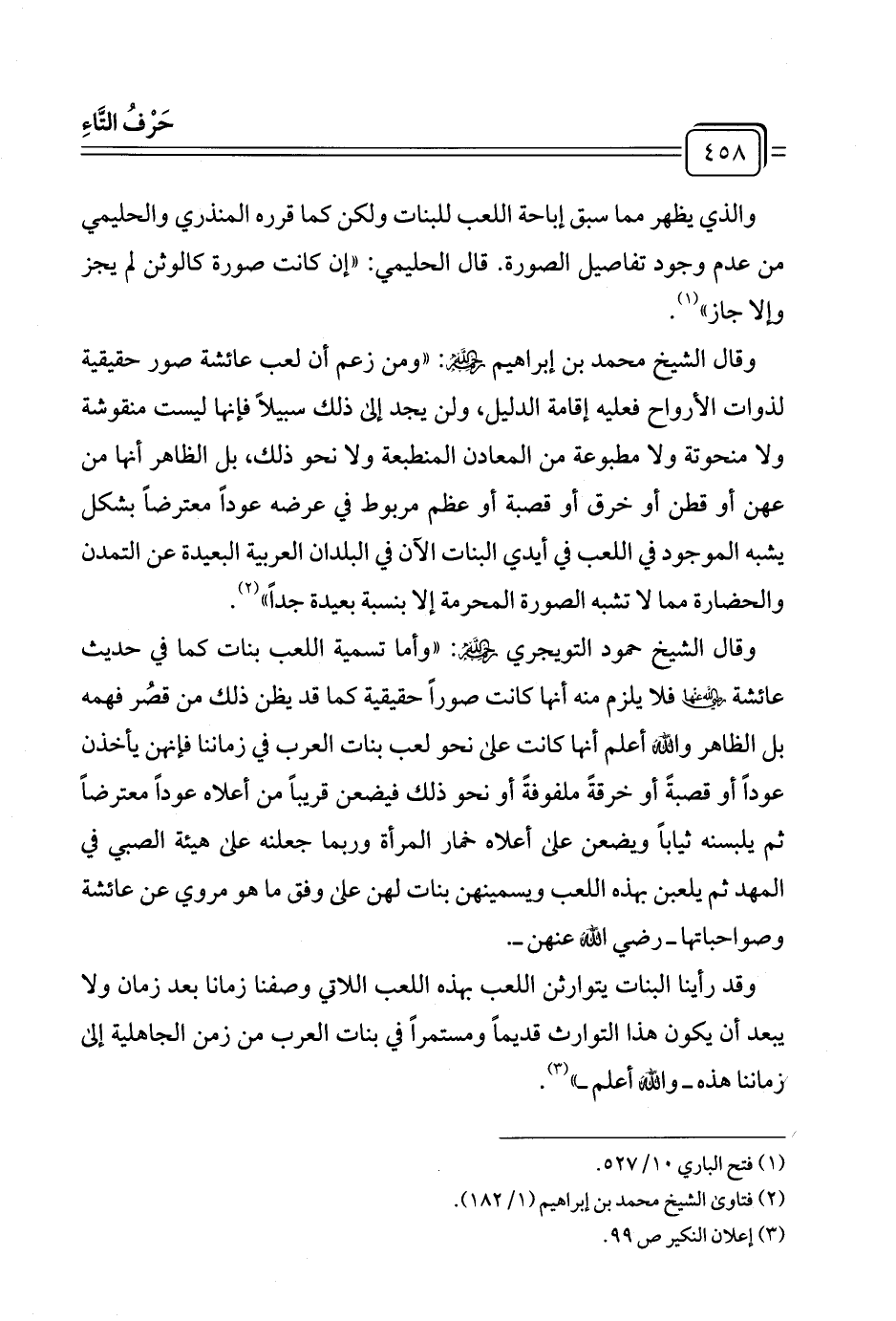 وقال الشيخ محمد بن إبراهيم -رحمه الله-: "ومن زعم أن لعب عائشة صور حقيقية لذوات الأرواح فعليه إقامة الدليل، ولن يجد إلى ذلك سبيلًا فإنها ليست منقوشة ولا منحوتة ولا مطبوعة من المعادن المنطبعة ولا نحو ذلك، بل الظاهر أنها من عهن أو قطن أو خرق أو قصبة أو عظم مربوط في عرضه عودًا معترضًا بشكل يشبه الموجود في اللعب في أيدي البنات الآن في البلدان العربية البعيدة عن التمدن والحضارة مما لا تشبه الصورة المحرمة إلا بنسبة بعيدة جدًا" (¬٢).
