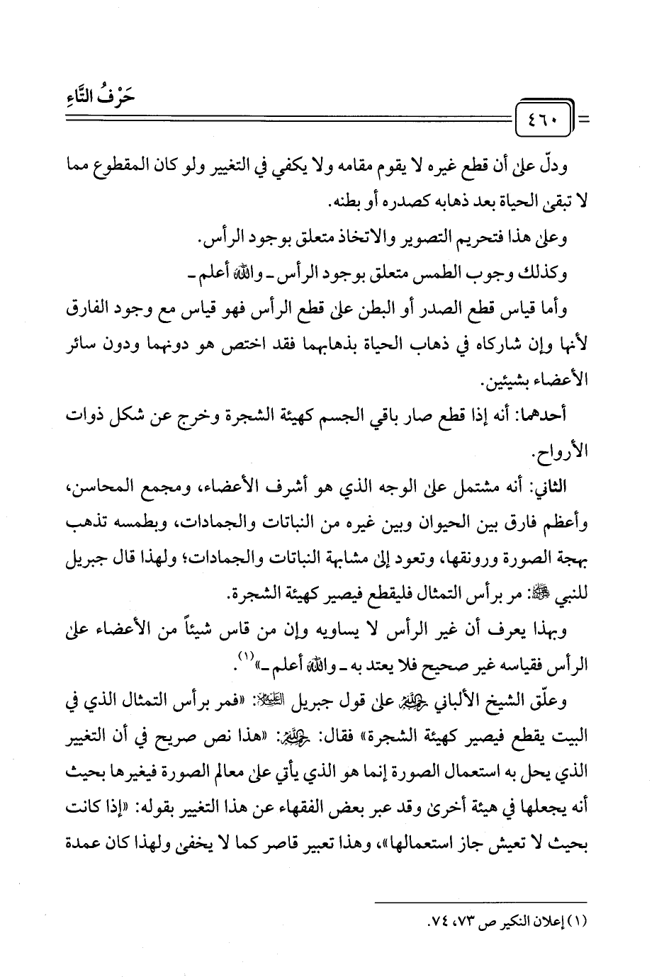 وعلّق الشيخ الألباني -رحمه الله- على قول جبريل -عليه السلام-: "فمر برأس التمثال الذي في البيت يقطع فيصير كهيئة الشجرة" فقال: -رحمه الله-: "هذا نص صريح في أن التغيير الذي يحل به استعمال الصورة إنما هو الذي يأتي على معالم الصورة فيغيرها بحيث أنه يجعلها في هيئة أخرى وقد عبر بعض الفقهاء عن هذا التغيير بقوله: "إذا كانت بحيث لا تعيش جاز استعمالها"، وهذا تعبير قاصر كما لا يخفى ولهذا كان عمدة