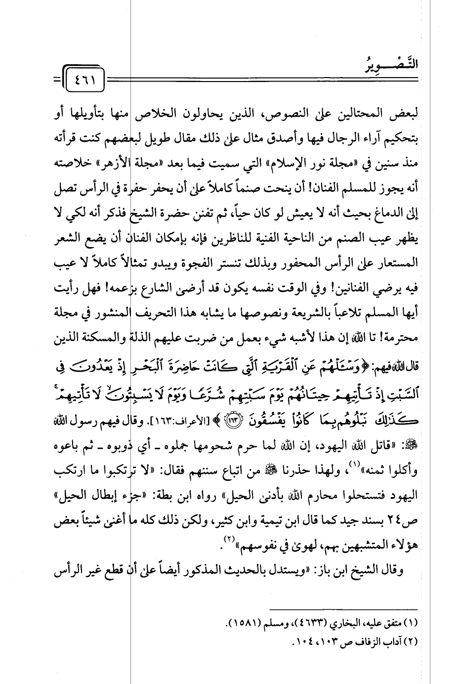 لبعض المحتالين على النصوص، الذين يحاولون الخلاص منها بتأويلها أو بتحكيم آراء الرجال فيها وأصدق مثال على ذلك مقال طويل لبعضهم كنت قرأته منذ سنين في "مجلة نور الإسلام" التي سميت فيما بعد "مجلة الأزهر" خلاصته أنه يجوز للمسلم الفنان! أن ينحت صنمًا كاملًا على أن يحفر حفرة في الرأس تصل إلى الدماغ بحيث أنه لا يعيش لو كان حيًا، ثم تفنن حضرة الشيخ فذكر أنه لكي لا يظهر عيب الصنم من الناحية الفنية للناظرين فإنه بإمكان الفنان أن يضع الشعر المستعار على الرأس المحفور وبذلك تنستر الفجوة ويبدو تمثالًا كاملًا لا عيب فيه يرضي الفنانين! وفي الوقت نفسه يكون قد أرضى الشارع بزعمه! فهل رأيت أيها المسلم تلاعبًا بالشريعة ونصوصها ما يشابه هذا التحريف المنشور في مجلة محترمة! تاالله إن هذا لأشبه شيء بعمل من ضربت عليهم الذلة والمسكنة الذين قال الله فيهم: {وَاسْأَلْهُمْ عَنِ الْقَرْيَةِ الَّتِي كَانَتْ حَاضِرَةَ الْبَحْرِ إِذْ يَعْدُونَ فِي السَّبْتِ إِذْ تَأْتِيهِمْ حِيتَانُهُمْ يَوْمَ سَبْتِهِمْ شُرَّعًا وَيَوْمَ لَا يَسْبِتُونَ لَا تَأْتِيهِمْ كَذَلِكَ نَبْلُوهُمْ بِمَا كَانُوا يَفْسُقُونَ (١٦٣)} [الأعراف: ١٦٣]. وقال فيهم رسول الله -صلى الله عليه وسلم-: "قاتل الله اليهود، إن الله لما حرم شحومها جملوه -أي ذوبوه- ثم باعوه وأكلوا ثمنه" (¬١)، ولهذا حذرنا -صلى الله عليه وسلم- من اتباع سننهم فقال: "لا ترتكبوا ما ارتكب اليهود فتستحلوا محارم الله بأدنى الحيل" رواه ابن بطة: "جزء إبطال الحيل" ص ٢٤ بسند جيد كما قال ابن تيمية وابن كثير، ولكن ذلك كله ما أغنى شيئًا بعض هؤلاء المتشبهين بهم، لهوى في نفوسهم" (¬٢).