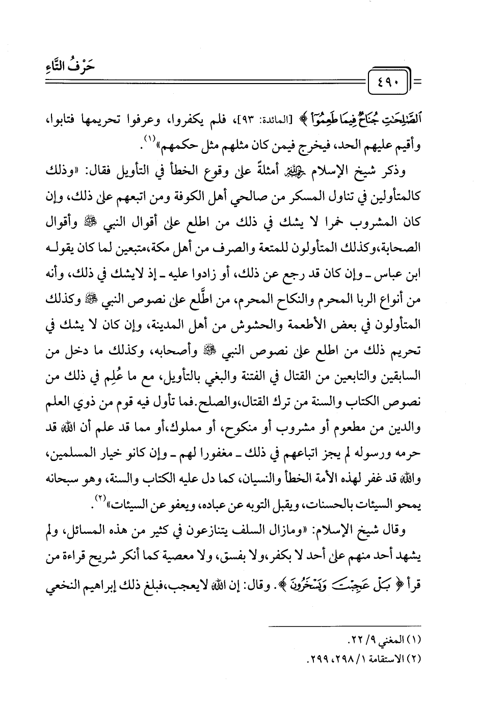 وذكر شيخ الإسلام -رحمه الله- أمثلةً على وقوع الخطأ في التأويل فقال: "وذلك كالمتأولين في تناول المسكر من صالحي أهل الكوفة ومن اتبعهم على ذلك، وإن كان المشروب خمرا لا يشك في ذلك من اطلع على أقوال النبي -صلى الله عليه وسلم- وأقوال الصحابة، وكذلك المتأولون للمتعة والصرف من أهل مكة، متبعين لما كان يقوله ابن عباس -وإن كان قد رجع عن ذلك، أو زادوا عليه- إذ لا يشك في ذلك، وأنه من أنواع الربا المحرم والنكاح المحرم، من اطَّلع على نصوص النبي -صلى الله عليه وسلم- وكذلك المتأولون في بعض الأطعمة والحشوش من أهل المدينة، وإن كان لا يشك في تحريم ذلك من اطلع على نصوص النبي -صلى الله عليه وسلم- وأصحابه، وكذلك ما دخل من السابقين والتابعين من القتال في الفتنة والبغي بالتأويل، مع ما عُلِم في ذلك من نصوص الكتاب والسنة من ترك القتال، والصلح. فما تأول فيه قوم من ذوي العلم والدين من مطعوم أو مشروب أو منكوح، أو مملوك، أو مما قد علم أن الله قد حرمه ورسوله لم يجز اتباعهم في ذلك -مغفورا لهم- وإن كانو خيار المسلمين، والله قد غفر لهذه الأمة الخطأ والنسيان، كما دل عليه الكتاب والسنة، وهو سبحانه يمحو السيئات بالحسنات، ويقبل التوبه عن عباده، ويعفو عن السيئات" (¬٢).