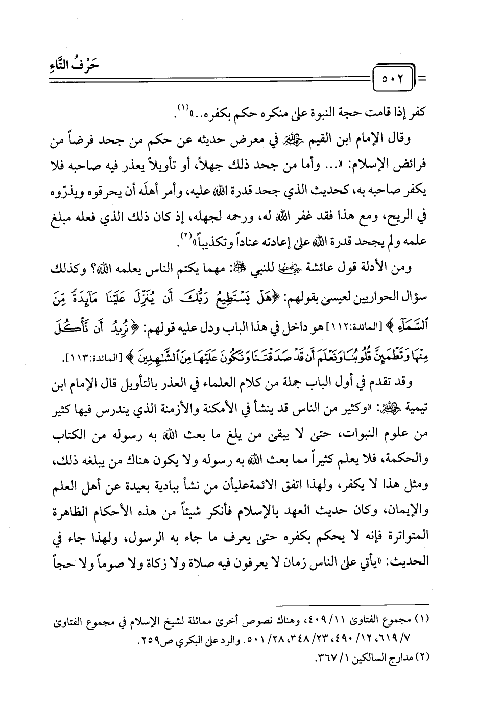 وقد تقدم في أول الباب جملة من كلام العلماء في العذر بالتأويل قال الإمام ابن تيمية -رحمه الله-: "وكثير من الناس قد ينشأ في الأمكنة والأزمنة الذي يندرس فيها كثير من علوم النبوات، حتى لا يبقى من يلغ ما بعث الله به رسوله من الكتاب والحكمة، فلا يعلم كثيرًا مما بعث الله به رسوله ولا يكون هناك من يبلغه ذلك، ومثل هذا لا يكفر، ولهذا اتفق الأئمة علي أن من نشأ ببادية بعيدة عن أهل العلم والإيمان، وكان حديث العهد بالإسلام فأنكر شيئًا من هذه الأحكام الظاهرة المتواترة فإنه لا يحكم بكفره حتى يعرف ما جاء به الرسول، ولهذا جاء في الحديث: "يأتي على الناس زمان لا يعرفون فيه صلاة ولا زكاة ولا صومًا ولا حجًا
