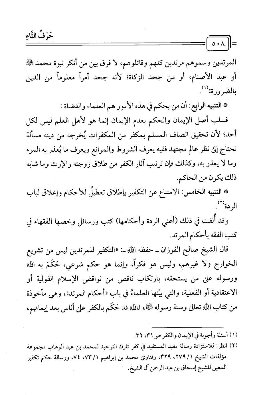 (¬٢) انظر: للاستزادة رسالة مفيد المستفيد في كفر تارك التوحيد لمحمد بن عبد الوهاب مجموعة مؤلفات الشيخ ١/ ٢٧٩، ٣٢٩، وفتاوى محمد بن إبراهيم ١/ ٧٣، ٧٤، ورسالة حكم تكفير المعين للشيخ إسحاق بن عبد الرحمن آل الشيخ.