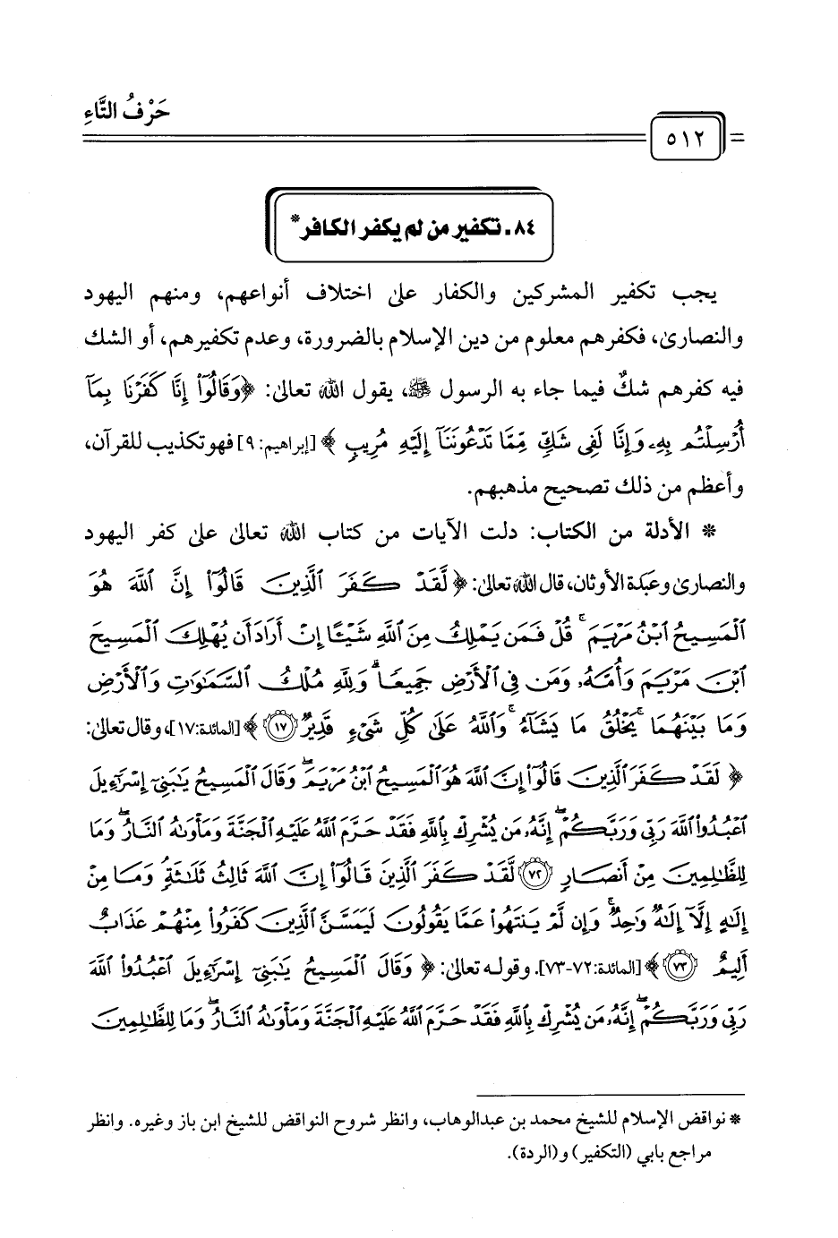 * الأدلة من الكتاب: دلت الآيات من كتاب الله تعالى على كفر اليهود والنصارى وعَبَدة الأوثان، قال الله تعالى: {لَقَدْ كَفَرَ الَّذِينَ قَالُوا إِنَّ اللَّهَ هُوَ الْمَسِيحُ ابْنُ مَرْيَمَ قُلْ فَمَنْ يَمْلِكُ مِنَ اللَّهِ شَيْئًا إِنْ أَرَادَ أَنْ يُهْلِكَ الْمَسِيحَ ابْنَ مَرْيَمَ وَأُمَّهُ وَمَنْ فِي الْأَرْضِ جَمِيعًا وَلِلَّهِ مُلْكُ السَّمَاوَاتِ وَالْأَرْضِ وَمَا بَيْنَهُمَا يَخْلُقُ مَا يَشَاءُ وَاللَّهُ عَلَى كُلِّ شَيْءٍ قَدِيرٌ (١٧)} [المائدة: ١٧]، وقال تعالى: {لَقَدْ كَفَرَ الَّذِينَ قَالُوا إِنَّ اللَّهَ هُوَ الْمَسِيحُ ابْنُ مَرْيَمَ وَقَالَ الْمَسِيحُ يَابَنِي إِسْرَائِيلَ اعْبُدُوا اللَّهَ رَبِّي وَرَبَّكُمْ إِنَّهُ مَنْ يُشْرِكْ بِاللَّهِ فَقَدْ حَرَّمَ اللَّهُ عَلَيْهِ الْجَنَّةَ وَمَأْوَاهُ النَّارُ وَمَا لِلظَّالِمِينَ مِنْ أَنْصَارٍ (٧٢) لَقَدْ كَفَرَ الَّذِينَ قَالُوا إِنَّ اللَّهَ ثَالِثُ ثَلَاثَةٍ وَمَا مِنْ إِلَهٍ إِلَّا إِلَهٌ وَاحِدٌ وَإِنْ لَمْ يَنْتَهُوا عَمَّا يَقُولُونَ لَيَمَسَّنَّ الَّذِينَ كَفَرُوا مِنْهُمْ عَذَابٌ أَلِيمٌ (٧٣)} [المائدة: ٧٢ - ٧٣]. وقوله تعالى: {وَقَالَ الْمَسِيحُ يَابَنِي إِسْرَائِيلَ اعْبُدُوا اللَّهَ رَبِّي وَرَبَّكُمْ إِنَّهُ مَنْ يُشْرِكْ بِاللَّهِ فَقَدْ حَرَّمَ اللَّهُ عَلَيْهِ الْجَنَّةَ وَمَأْوَاهُ النَّارُ وَمَا لِلظَّالِمِينَ