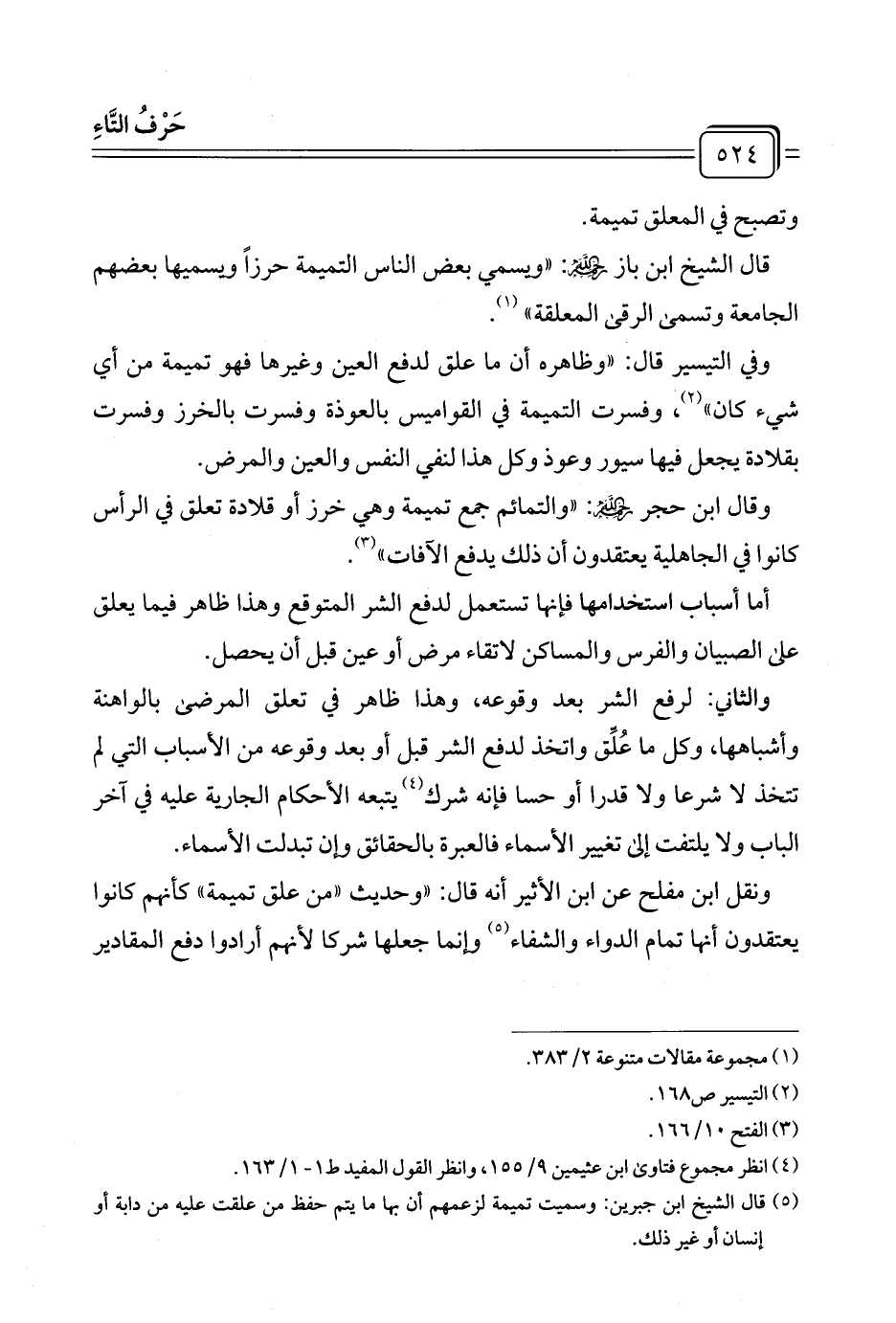 (¬٥) قال الشيخ ابن جبرين: وسميت تميمة لزعمهم أن بها ما يتم حفظ من علقت عليه من دابة أو إنسان أو غير ذلك.