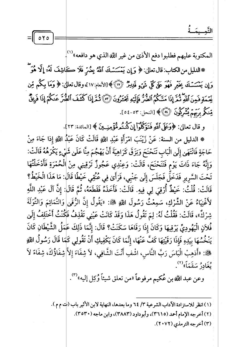 * الدليل من السنة: عَنْ زَيْنَبَ امْرَأَةِ عَبْدِ اللهِ قَالَتْ كَانَ عَبْدُ اللهِ إذا جَاءَ مِنْ حاجةٍ فانْتهَى إِلَى الْبَابِ تَنَحْنَحَ وَبَزَقَ كَرَاهِيَةَ أَنْ يَهْجُمَ مِنَّا عَلَى شَيْءٍ يَكْرَهُهُ قَالَتْ: وَإِنَّهُ جَاءَ ذَاتَ يَوْمٍ فَتَنَحْنَحَ قَالَتْ: وَعِنْدِي عَجُوزٌ تَرْقِينِي مِنْ الْحُمْرَةِ فَأَدْخَلتُهَا تَحْتَ السَّريرِ فَدَخَلَ فَجَلَسَ إِلَى جَنْبِي فَرَأَى فِي عُنُقِي خَيْطًا قَالَ: مَا هَذَا الْخَيْطُ؟ قَالَتْ: قُلْتُ: خَيْطٌ أُرْقِيَ لِي فِيهِ. قَالَتْ: فَأَخَذَهُ فَقَطَعَهُ، ثُمَّ قَالَ: إِنَّ آلَ عَبْدِ اللهِ لأَغْنِيَاءُ عَنْ الشِّرْكِ سَمِعْتُ رَسُولَ اللهِ صلَّى اللهُ عليهِ وسلَّمَ: "يَقُولُ إِنَّ الرُّقَى والتَّمَائِمَ وَالتِّوَلَةَ شِرْكٌ"، قَالَتْ: فَقُلْتُ لَهُ: لِمَ تَقُولُ هَذَا وَقَدْ كَانَتْ عَيْنِي تَقْذِفُ فَكُنْتُ أَخْتَلِفُ إِلَى فُلَانٍ الْيَهُوديِّ يَرْقِيهَا وَكَانَ إِذَا رَقَاهَا سَكَنَتْ؟ قَالَ: إنَّمَا ذلكَ عَمَلُ الشَّيْطَانِ كَانَ يَنْخُسُها بِيَدِهِ فَإِذَا رَقَيْتِهَا كَفَّ عَنْهَا، إنَّمَا كَانَ يَكْفِيكِ أَنْ تَقُولي كَمَا قَالَ رَسُولُ اللهِ -صلى الله عليه وسلم-: "أَذْهِبْ الْبَاسَ رَبَّ النَّاسِ، اشْفِ أَنْتَ الشَّافِي، لَا شِفَاءَ إِلَّا شِفَاؤُكَ، شِفَاءً لَا يُغَادِرُ سَقَمًا" (¬٢).