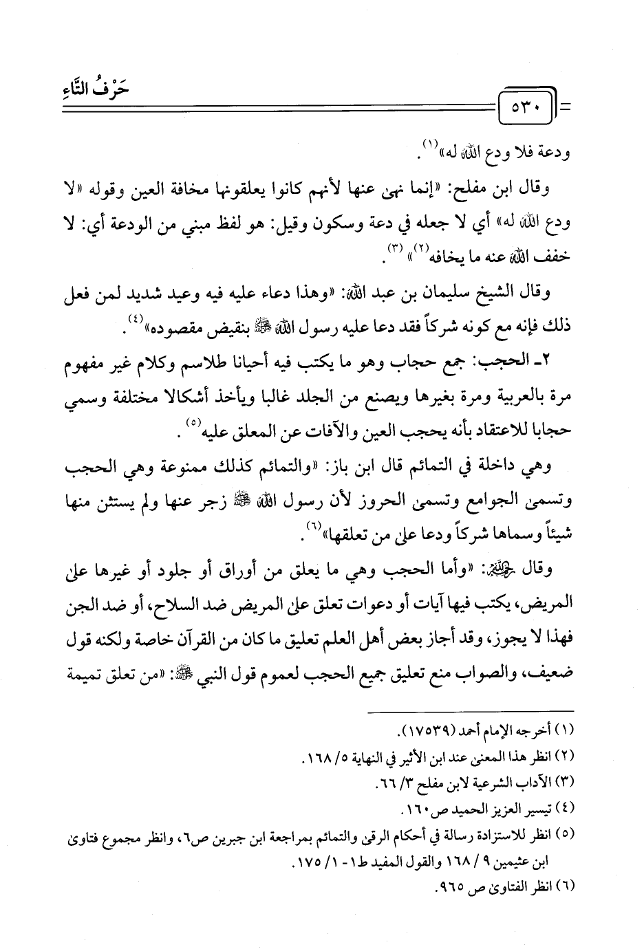 (¬٥) انظر للاستزادة رسالة في أحكام الرقى والتمائم بمراجعة ابن جبرين ص ٦، وانظر مجموع فتاوي ابن عثيمين ٩/ ١٦٨ والقول المفيد ط ١ - ١/ ١٧٥.