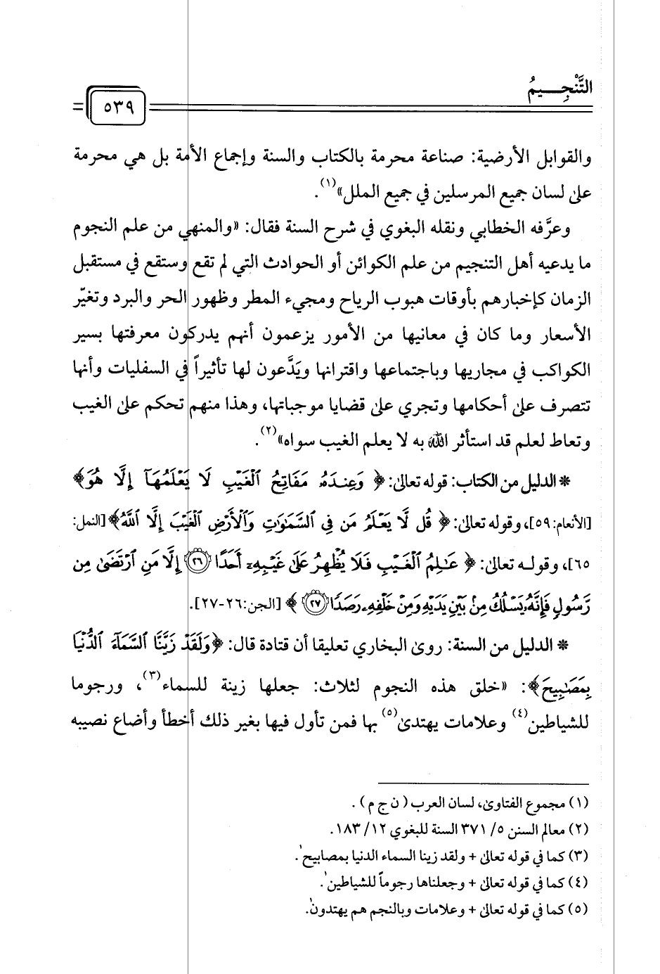 وعرَّفه الخطابي ونقله البغوي في شرح السنة فقال: "والمنهي من علم النجوم ما يدعيه أهل التنجيم من علم الكوائن أو الحوادث التي لم تقع وستقع في مستقبل الزمان كإخبارهم بأوقات هبوب الرياح ومجيء المطر وظهور الحر والبرد وتغيّر الأسعار وما كان في معانيها من الأمور يزعمون أنهم يدركون معرفتها بسير الكواكب في مجاريها وباجتماعها واقترانها ويَدَّعون لها تأثيرًا في السفليات وأنها تتصرف على أحكامها وتجري على قضايا موجباتها، وهذا منهم تحكم على الغيب وتعاط لعلم قد استأثر الله به لا يعلم الغيب سواه" (¬٢).