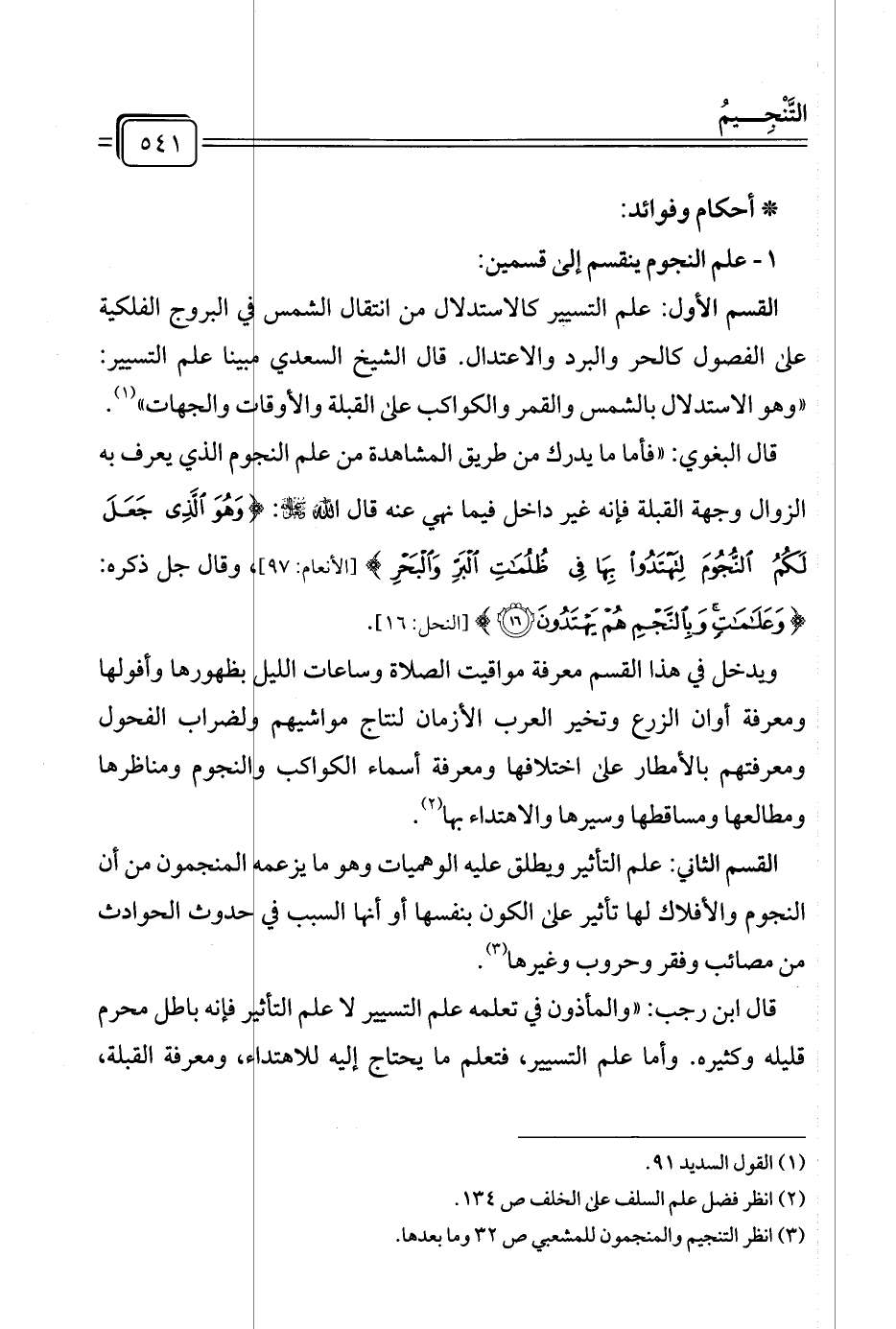 قال البغوي: "فأما ما يدرك من طريق المشاهدة من علم النجوم الذي يعرف به الزوال وجهة القبلة فإنه غير داخل فيما نهي عنه قال الله سبحانه وتعالى: {وَهُوَ الَّذِي جَعَلَ لَكُمُ النُّجُومَ لِتَهْتَدُوا بِهَا فِي ظُلُمَاتِ الْبَرِّ وَالْبَحْرِ} [الأنعام: ٩٧]، وقال جل ذكره: {وَعَلَامَاتٍ وَبِالنَّجْمِ هُمْ يَهْتَدُونَ (١٦)} [النحل: ١٦].
