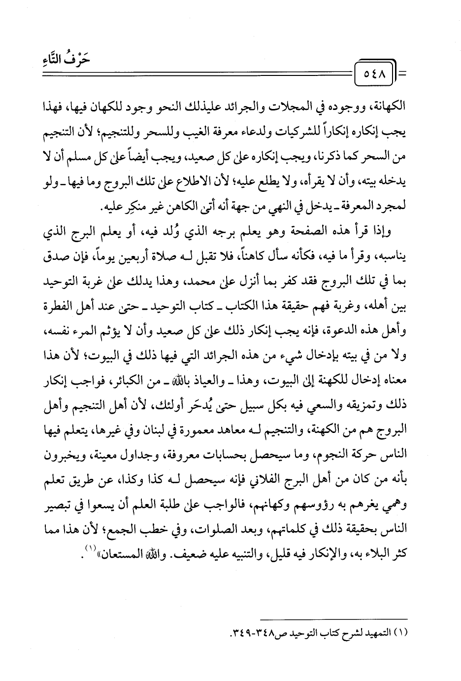 وإذا قرأ هذه الصفحة وهو يعلم برجه الذي وُلد فيه، أو يعلم البرج الذي يناسبه، وقرأ ما فيه، فكأنه سأل كاهنًا، فلا تقبل له صلاة أربعين يومًا، فإن صدق بما في تلك البروج فقد كفر بما أنزل على محمد، وهذا يدلك على غربة التوحيد بين أهله، وغربة فهم حقيقة هذا الكتاب -كتاب التوحيد- حتى عند أهل الفطرة وأهل هذه الدعوة، فإنه يجب إنكار ذلك على كل صعيد وأن لا يؤثم المرء نفسه، ولا من في بيته بإدخال شيء من هذه الجرائد التي فيها ذلك في البيوت؛ لأن هذا معناه إدخال للكهنة إلى البيوت، وهذا -والعياذ بالله- من الكبائر، فواجب إنكار ذلك وتمزيقه والسعي فيه بكل سبيل حتى يُدحَر أولئك، لأن أهل التنجيم وأهل البروج هم من الكهنة، والتنجيم له معاهد معمورة في لبنان وفي غيرها، يتعلم فيها الناس حركة النجوم، وما سيحصل بحسابات معروفة، وجداول معينة، ويخبرون بأنه من كان من أهل البرج الفلاني فإنه سيحصل له كذا وكذا، عن طريق تعلم وهمي يغرهم به رؤوسهم وكهانهم، فالواجب على طلبة العلم أن يسعوا في تبصير الناس بحقيقة ذلك في كلماتهم، وبعد الصلوات، وفي خطب الجمع؛ لأن هذا مما كثر البلاء به، والإنكار فيه قليل، والتنبيه عليه ضعيف. والله المستعان" (¬١).