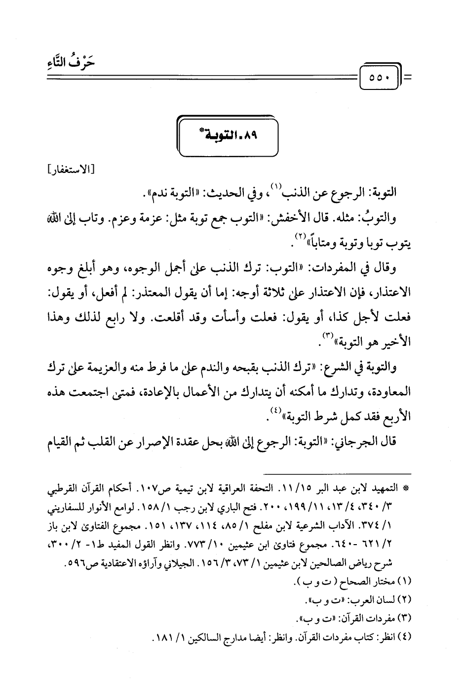وقال في المفردات: "التوب: ترك الذنب على أجمل الوجوه، وهو أبلغ وجوه الاعتذار، فإن الاعتذار على ثلاثة أوجه: إما أن يقول المعتذر: لم أفعل، أو يقول: فعلت لأجل كذا، أو يقول: فعلت وأسأت وقد أقلعت. ولا رابع لذلك وهذا الأخير هو التوبة" (¬٣).
