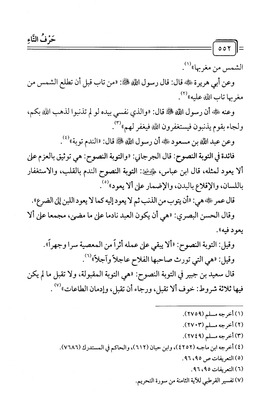 فائدة في التوبة النصوح: قال الجرجاني: "والتوبة النصوح: هي توثيق بالعزم على ألا يعود لمثله، قال ابن عباس، -رضي الله عنها-: التوبة النصوح الندم بالقلب، والاستغفار باللسان، والإقلاع بالبدن، والإضمار على ألا يعود" (¬٥).