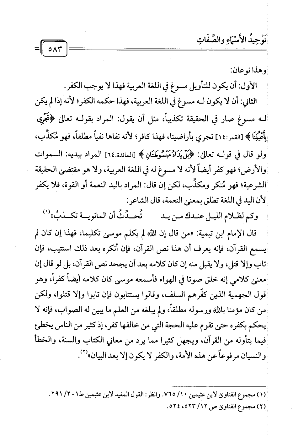 الثاني: أن لا يكون له مسوغ في اللغة العربية، فهذا حكمه الكفر؛ لأنه إذا لم يكن له مسوغ صار قي الحقيقة تكذيبًا، مثل أن يقول: المراد بقوله تعالى {تَجْرِي بِأَعْيُنِنَا} [القمر: ١٤] تجري بأراضينا، فهذا كافر؛ لأنه نفاها نفيًا مطلقًا، فهو مُكذِّب، ولو قال في قوله تعالى: {بَلْ يَدَاهُ مَبْسُوطَتَانِ} [المائدة. ٦٤] المراد بيديه: السماوات والأرض؛ فهو كفر أيضًا لأنه لا مسوغ له في اللغة العربية، ولا هو مقتضى الحقيقة الشرعية؛ فهو مُنكر ومكذِّب، لكن إن قال: المراد باليد النعمة أو القوة، فلا يكفر لأن اليد في اللغة تطلق بمعنى النعمة، قال الشاعر: