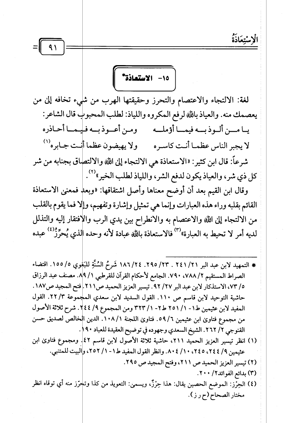 (¬١) انظر تيسير العزيز الحميد ٢١١، حاشية ثلاثة الأصول لابن قاسم ٤٢. ومجموع فتاوى ابن عثيمين ٩/ ٢٤٤، ٢٤٥، ١٠/ ٨٠٤. وانظر القول المفيد ط ١ - ١/ ٢٥٢، البيت للمتنبي.