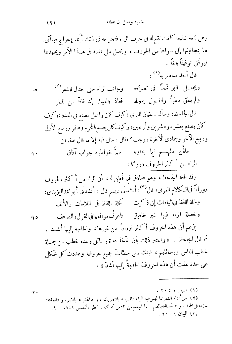 يزعم أن هذه الحروف أكثر ترداداً من غيرها، والحاجة إليها أشد. ثم قال الجاحظ: "واعتبر ذلك بأن تأخذ عدة رسائل وعدة خطب من جملة خطب الناس ورسائلهم، فإنك متى حصلت جميع حروفها وعددت كل شيء على حدة علمت أن هذه الحروف الحاجة إليها أشد".