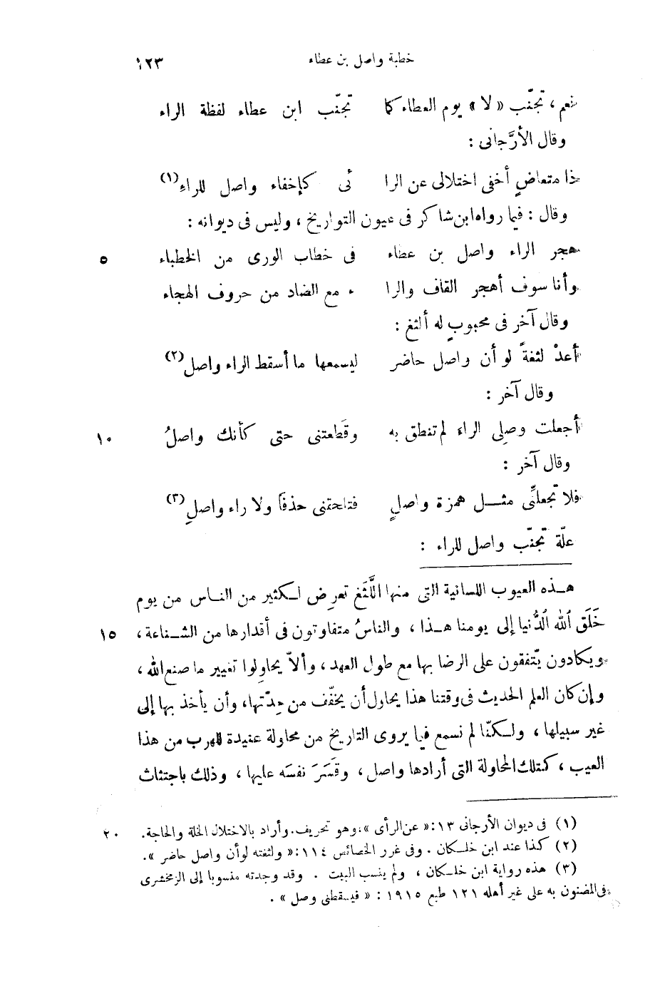 علة تجنب واصل للراء: هذه العيوب اللسانية التي منها اللثغ تعرض لكثير من الناس من يوم خلق الله الدنيا إلى يومنا هذا، والناس متفاوتون في أقدارها من الشفاعة، ويكادون يتفقون على الرضا بها مع طول العهد، وألا يحاولوا تغيير ما صنع الله، وإن كان العلم الحديث في وقتنا هذا يحاول أن يخفف من حدتها، وأن يأخذ بها إلى غير سبيلها، ولكنا لم نسمع فيما يروى في التاريخ من محاولة عنيدة للهرب من هذا العيب، كتلك المحاولة التي أرادها واصل، وقسر نفسه عليها، وذلك باجتثاث