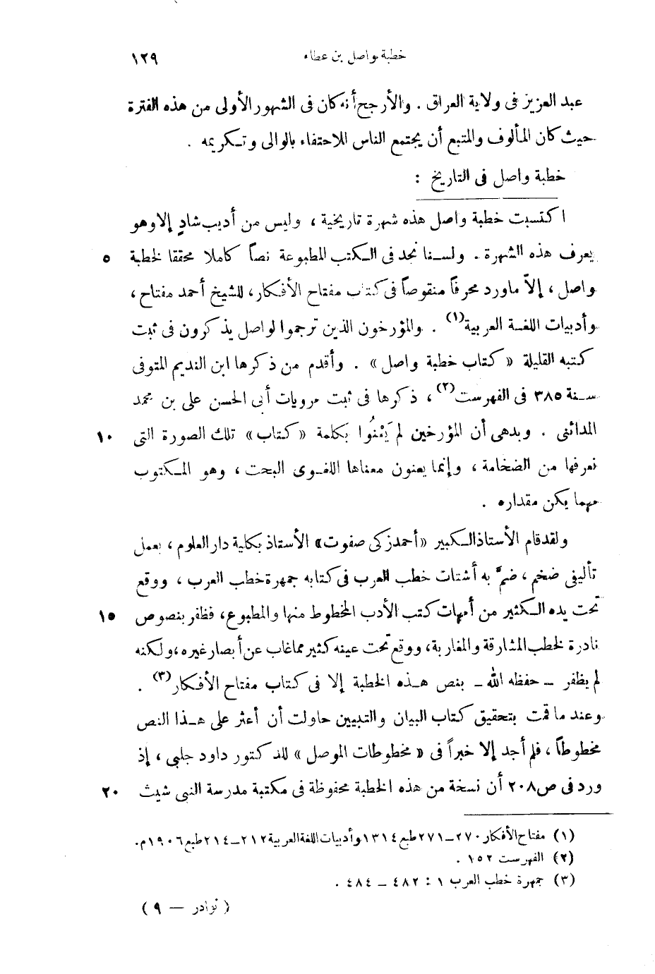 اكتسبت خطبة واصل هذه شهرة. وتاريخية، وليس من وأديب شادٍ إلا وهو يعرف هذه الشهرة. ولسنا تجد في الكتب المطبوعة نصاً كاملا محققا لخطبة واصل، إلا ما ورد محرفاً منقوصاً في كتاب مفتاح الأفكار، للشيخ أحمد مفتاح، وأدبيات اللغة العربية. والمؤرخون الذين ترجموا لواصل يذكرون في ثبت كتبه القليلة"كتاب خطبة واصل". وأقدم من ذكرها ابن النديم المتوفي سنة 358 في الفهرست، ذكرها في ثبت مرويات أبي الحسن على محمد المدائني، وبدهي أن المؤرخين لم يعنوا بكلمة"كتاب" تلك الصورة التي نعرفها من الضخامة، وإنما يعنون معناها اللغوي البحت، وهو المكتوب منها يكن مقداره. ولقد قام الأستاذ الكبير"أحمد زكى صفوت" الأستاذ بكلية دار العلوم، بعمل تأليفي ضخم، وضمَّ به أشتات خطب العرب، ووقع تحت يده الكثير من أمهات كتب الأدب المخطوط منها والمطبوع، فظفر بنصوص نادرة لخطب المشارقة والمغاربة، ووقع تحت عينه كثير مما غاب عن أبصار غيره، ولكنه لم يظفر حفظه الله بنص هذه الخطبة إلا في كتاب مفتاح الأفكار. وعند ما قمت بتحقيق كتاب البيان والتبيين حاولت أن أعثر على هذا النص مخطوطاً، فلم أجد إلا خبراً في "مخطوطات الموصل" للدكتور داود جلبي، إذ ورد في ص208 أن نسخة من هذه محفوظة في مكتبة مدرسة النبي شيث