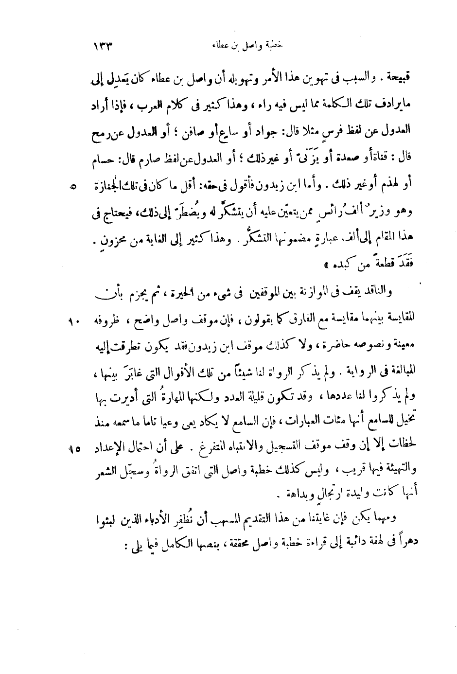 قبيحة. والسبب في تهوين هذا الأمر وتهويله أن واصل بن عطاء كان يعدِل إلى ما يرادف تلك الكلمة مملا ليس فيه راء، وهذا كثير في كلام العرب، فإذا أراد العدول عن لفظ فرسٍ مثلا قال: جواد أو ساٍع أو صافن، أو العدول عن رمح قال: قناة أو صعدة أو يزنىّ أو غير ذلك، أو العدول عن لفظ صارم قال: حسام أو لهذم أو غير ذلك. وأما ابن زيدون فأقول في حقه: أقل ما كان في تلك الجنازة وهو وزير ألف رائسٍ ممن يتعيّن عليه أن يتشكَّر له ويضطرّ إلى ذلك، فيحتاج في هذا المقام إلى ألف عبارةٍ مضمونها التشكُّر. وهذا كثير إلى الغاية من محزونٍ. فقد قطعةً من كبده" والناقد يقف في الموازنة بين الموقفين في شيء من الحيرة، ثم يجزم بأن المقايسة بينها مقايسة مع الفارق كما يقولون، فإن موقف واصل واضح، ظروفه معينه ونصوصه حاضرة، ولا كذلك موقف ابن زيدون فقد يكون تطرقت إليه المبالغة في الرواية. ولم يذكر الرواة لنا شيئاً من تلك الأقوال التي غابر بينها، ولم يذكروا لنا عددها، وقد تكون قليلة العدد ولكنها المهارةُ التي أديرت بها تخيل للسامع أنها مئات العبارات، فإن السامع لا يكاد يعي وعيا تاما ما سمعه منذ لحظات إلا إن وقف موقف التسجيل والانتباه المتفرغ. على أن احتمال الإعداد والتهيئة فيها قريب، وليس كذلك خطبة واصل التي اتفق الرواة وسجّل الشعر أنها كانت وليدة ارتجالٍ وبداهة. ومهما يكن فإن غايتنا من هذا التقديم المسهب نظفر الأدباء الذين لبثوا دهراً في لهفة دائبة إلى قراءة خطبه واصل محققة، بنصها الكامل فيما يلي: