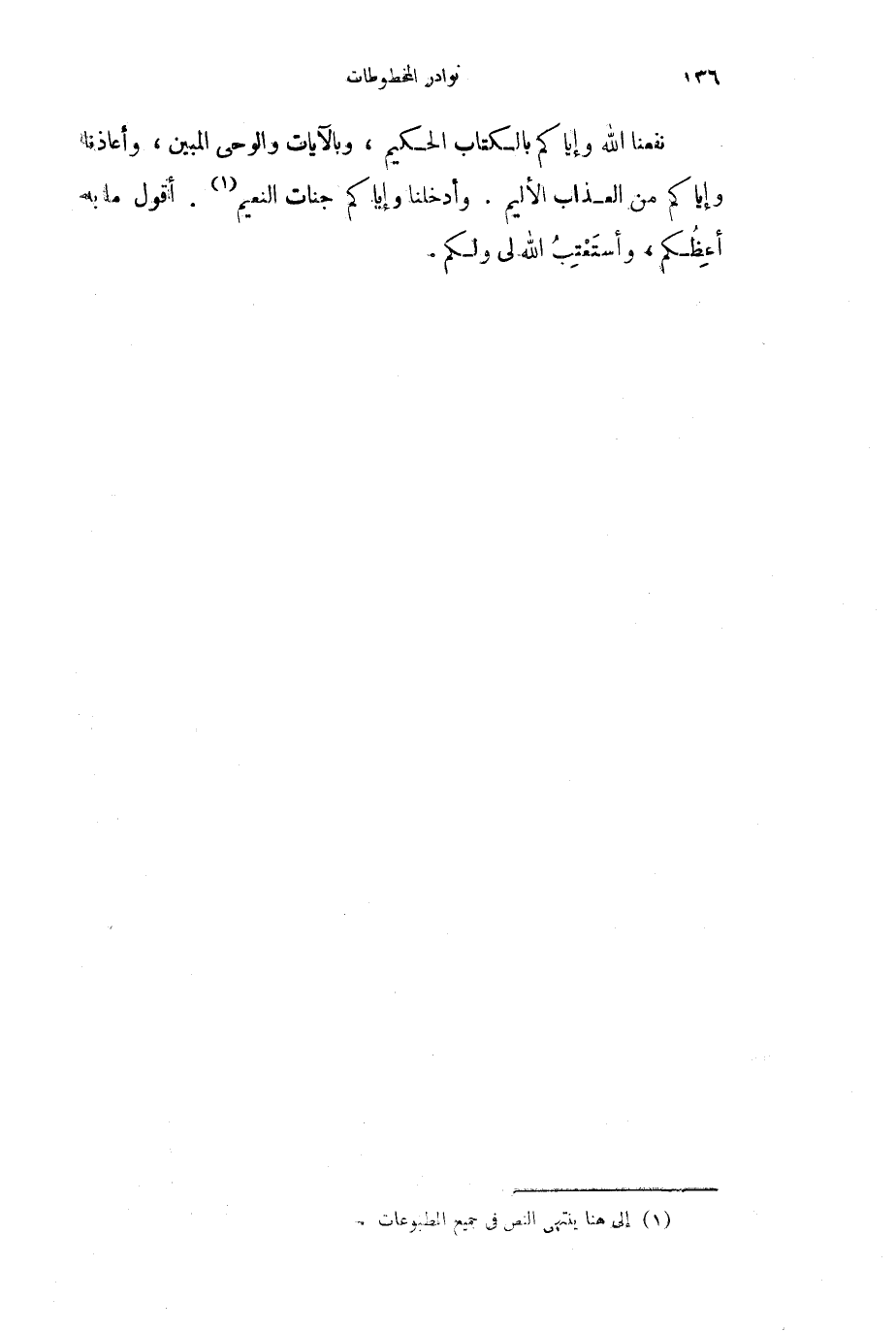 نفعنا الله وإياكم بالكتاب الحكيم، وبالآيات والوحي المبين، وأعاذنا وإياكم من العذاب الأليم. وأدخلنا وإياكم جنات النعيم. أقول ما به أعظكم، وأستعتب والله لي ولكم.