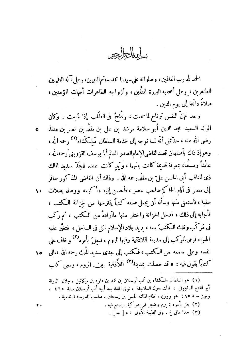 وبعد فإن النفس ترتاح لما سمعت، وتلح في الطلب إذا منعت. وكان الوالد السعيد مجد الدين أبو سلامة مرشد بن علي بن مقلد بن نصر بن منقذ رضي الله عنه، حدثني أنه لما توجه إلى خدمة السلطان ملكشاه رحمه الله، وهو إذ ذاك بأصفهان قصد القاضي الإمام الصدر العالم أبا يوسف القزويني رحمه الله، عائداً ومسلماً، بمعرفة قديمة كانت بينهما، ويد كانت عنده للجد سديد الملك ذي المناقب أبي الحسن علي بن مقلد رحمه الله. وذاك أن القاضي المذكور سافر إلى مصر في أيام الحاكم صاحب مصر، فأحسن إليه وأكرمه وصله بصلات سنية، فاستعفى منها وسأله أن يجعل صلته كتباً يقترحها من خزانة الكتب، فأجابه إلى ذلك، فدخل الخزانة واختار منها ما أراده من الكتب، ثم ركب في مركب وتلك الكتب معه، يريد بلاد الإسلام التي في الساحل، فتغير عليه الهواء فرمى بالمركب إلى مدينة اللاذقية وفيها الروم، فبعل بأمره وخاف على نفسه وعلى ما معه من الكتب، فكتب إلى جدى سديد الملك رحمه الله تعالى كتاباً يقول فيه: "قد حصلت بمدينة اللاذقية بين الروم، ومعي كتب