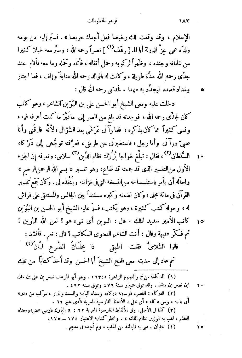 الإسلام وقد وقعت لك رخيصاً فهل أجدك حريصاً". فسير إليه من يومه ولده عمى عز الدولة أبا الم [رهف] نصراً رحمه الله، وسير معه خيلا كثيراً من غلمانه وجنده، وظهراً لركوبه وحمل أثقاله، فأتاه وحمله وما معه فأقام عند جدى رحمه الله مدة طويلة، وكانت له بالوالد رحمه الله عناية وإلف، فلما اجتاز ببغداد قصده ليجدد به عهدا، فحدثني رحمه الله قال: دخلت عليه ومعي الشيخ أبو الحسن علي بن البوين الشاعر، وهو كاتب كان لجدى رحمه الله، فوجدته قد بلغ من العمر إلى ما غير ما كنت أعرفه فيه، ونسي كثيراً مما كان يذكره، فلما رآني عرفني بعد السؤال، لأنه فارقني وأنا صبي ورآني وأنا رجل، فاستخبرني عن طريقي، فعرفته توجهي إلى دركاه السلطان، فقال: تبلغ خواجا بزرك نظام الدين سلامي، وتعرفه إن الجزء الأول من التفسير الذي قد جمعته قد ضاع، وهو تفسير "بسم الله الرحمن الرحيم" واسأله أن يأمر باستنساخه من النسخة التي في خزانته وينفذه لي. وكان جمع تفسير القرآن في مجلد، وكان لضعفه وكبره مستنداً بين الجالس والمستلقي على فراش له، وحوله كتب كثيرة، وهو يكتب، فسلم عليه الشيخ أبو الحسن بن البوين كاتب الأمير سديد الملك. قال: البوين أي شيء هو؟ لعن الله البوين! ثم فكر هنيهة وقال: أنت الشاعر النحوي الكاتب؟ قال: نعم. فأنشد: