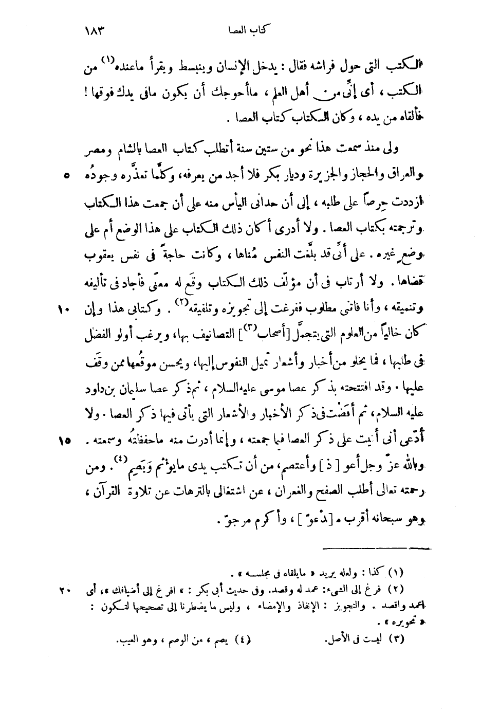 ولي منذ سمعت هذا نحو من ستين سنة أتطلب كتاب العصا بالشام ومصر والعراق والحجاز والجزيرة وديار بكر فلا أجد من يعرفه، وكلما تعذر وجوده ازددت حرصاً على طلبه، إلى أن حداني اليأس منه على أن جمعت هذا الكتاب وترجمته بكتاب العصا. ولا أدري أكان ذاك الكتاب على هذا الوضع أم على وضع غيره. على أني قد بلغت النفس مناها، وكانت حاجة في نفس يعقوب قضاها. ولا أرتاب في أن مؤلف ذلك الكتاب وقع له معنى فأجاد في تأليفه وتنميقه، وأنا فاتني مطلوب ففرغت إلى تجويزه وتلفيقه. وكتابي هذا وإن كان خالياً من العلوم التي يتجمل [أصحاب] التصانيف بها، ويرغب أولو الفضل في طلبها، فما يخلو من أخبار وأشعار تميل النفوس إليها، ويحسن موقعها ممن وقف عليها. وقد افتتحه بذكر عصا موسى عليه السلام، ثم ذكر عصا سليمان بن داود عليه السلام، ثم أفضت في ذكر الأخبار والأشعار التي يأتي فيها ذكر العصا. ولا أدعي أني أتيت على ذكر العصا فيما جمعته، وإنما أدرت منه ما حفظته وسمعته. وبالله عز وجل أعو [ذ] وأعتصم، من أن تكتب يدي ما يؤثم ويصم. ومن رحمته تعالى أطلب الصفح والغفران، عن اشتغالي بالترهات عن تلاوة القرآن، وهو سبحانه أقرب م [دعو] ، وأكرم مرجو.