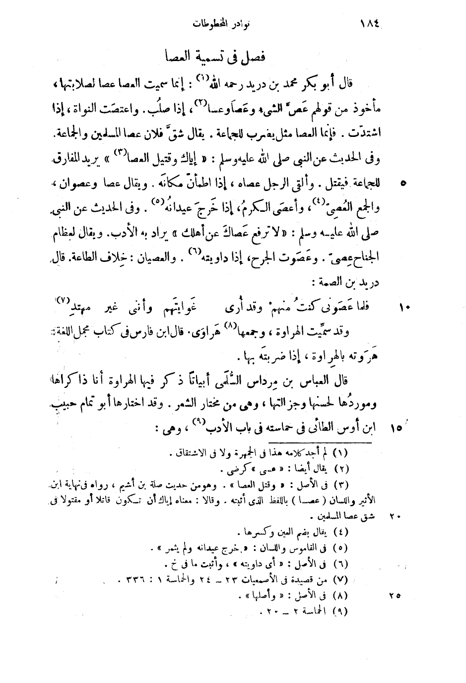قال أبو بكر محمد بن دريد رحمه الله: إنما سميت العصا عصا لصلابتها، مأخوذ من قولهم عصَّ الشيء وعصا وعسا، إذا صلب. واعتصت النواة، إذا اشتدت. فإنما العصا مثل يضرب للجماعة. يقال شق فلان عصا المسلمين والجماعة. وفي الحديث عن النبي صلى الله عليه وسلم: "إياك وقتيل العصا" يريد المفارق للجماعة فيقتل. وألقى الرجل عصاه، إذا اطمأن مكانه. ويقال عصا وعصوان، والجمع العصي، وأعصى الكرم، إذا خرج عيدانه. وفي الحديث عن النبي صلى الله عليه وسلم: "لا ترفع عصاك عن أهلك" يراد به الأدب. ويقال لعظام الجناح عصي. وعصوت الجرح، إذا داويته. والعصيان: خلاف الطاعة. قال: دريد بن الصمة: