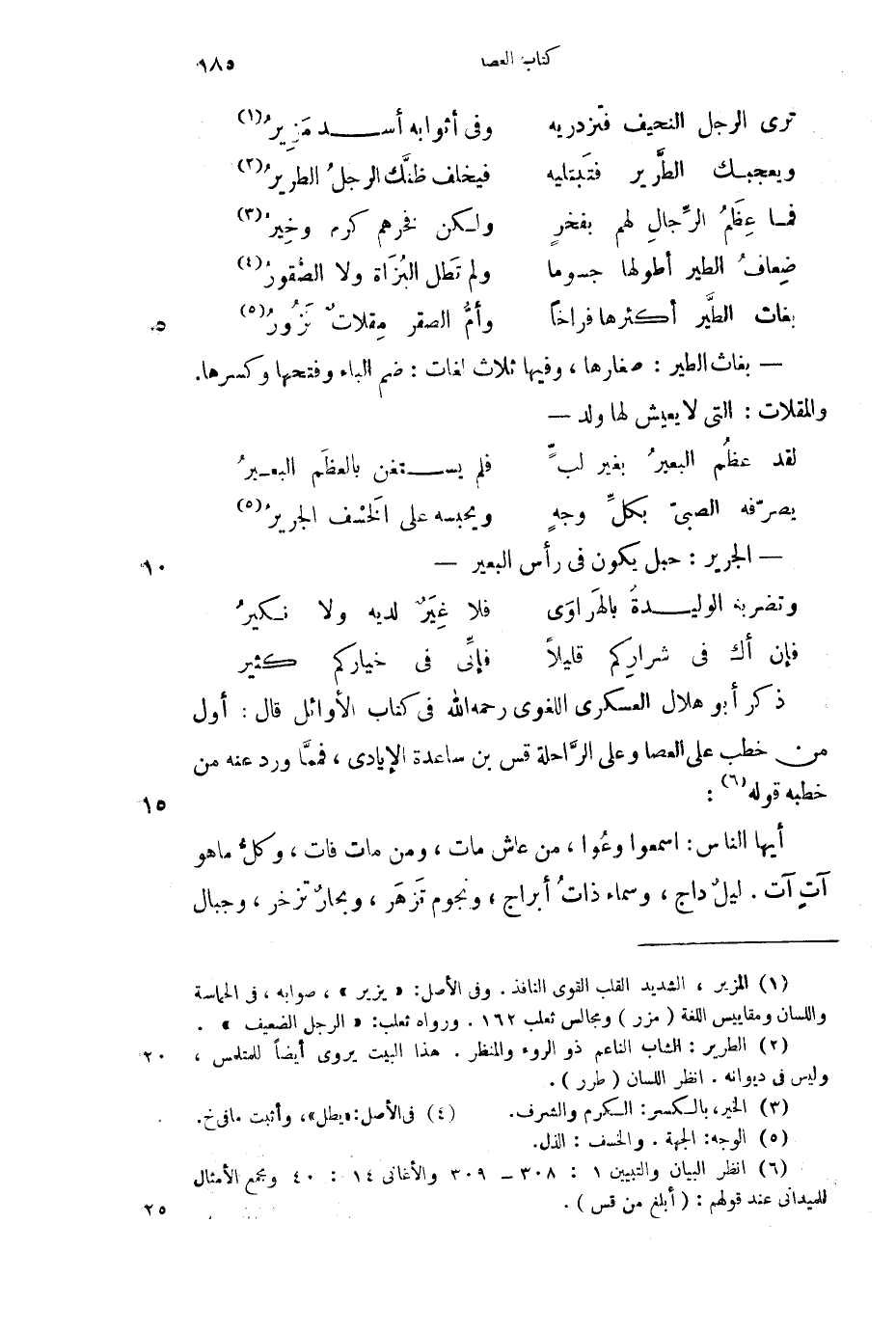 ذكر أبو هلال العسكري اللغوي رحمه الله في كتاب الأوائل قال: أول من خطب على العصا وعلى الراحلة قس بن ساعدة الإيادي، فمما ورد عنه من خطبه قوله: أيها الناس: اسمعوا وعوا، من عاش مات، ومن مات فات، وكل ما هو آت آت. ليل داج، وسماء ذات أبراج، ونجوم تزهر، وبحار تزخر، وجبال