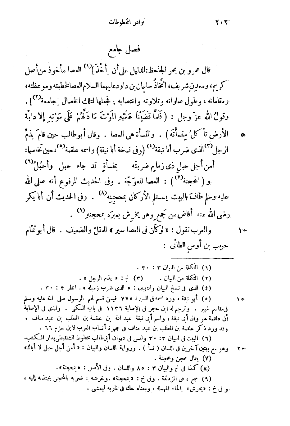 قال عمرو بن بحر الجاحظ: الدليل على أن [أخذ] العصا مأخوذ من أصل كريم، ومعدن شريف، اتخاذ سليمان بن داود عليهما السلام العصا لخطبته وموعظته، ومقاماته، وطول صلواته وتلاوته وانتصابه. فجعلها لتلك الخصال [جامعة] . وقول الله عز وجل: (فلمَّا قضينا عليهِ الموتَ ما دلَّهمْ على موتهِ إلا دابّة الأرض تأكلُ منسأته) . والمنسأة هي العصا. وقال أبو طالب حين قام بذم الرجل الذي ضرب أبا نبقة (وفي نسخة أبا نيقة) واسمه علقمة، حين تخاصما: