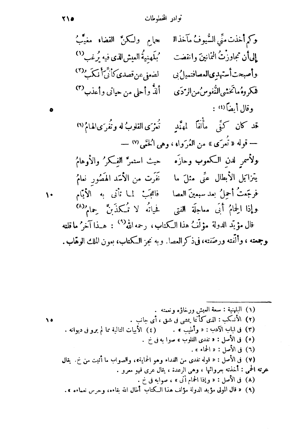 قال مؤيد الدولة مؤلف هذا الكتاب، رحمه الله: هذا آخر ما قلته وجمعته، وألفته ورصفته، في ذكر العصا. وبه نجز الكتاب، بعون الملك الوهاب.