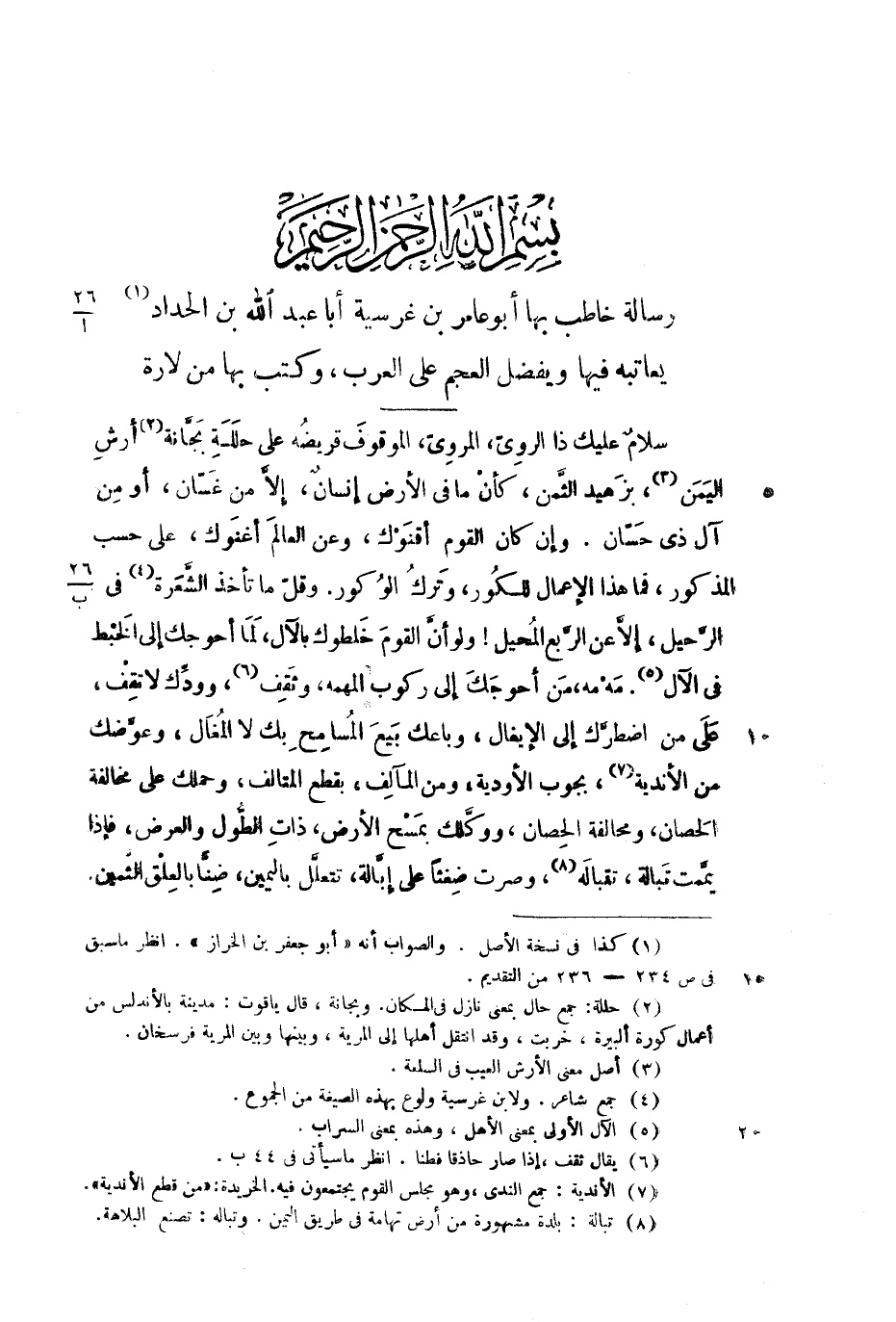 سلام عليك ذا الروى، المروى، الموقوف قريضه على حللة بجانة أرش اليمن، بزهيد الثمن، كأن ما في الأرض إنسان، إلا من غسان، أومن آل ذي حسان. وإن كان القوم أقنوك، وعن العالم أغنوك، على حسب المذكور، فما هذا الإعمال للكور، وترك الوكور. وقل ما تأخذ الشعرة في الرحيل، إلا عن الربع المحيل! ولو أن القوم خلطوك بالآل، لما أحوجك إلى الخبط في الآل. مه مه، من أحوجك إلى ركوب المهمة، وثقف، وودك لا تقف، على من اضطرك إلى الإيغال، وباعك بيع المسامح بك لا المغال، وعوضك من الأندية، بجوب الأودية، ومن المآلف، بقطع المتالف، وحملك على مخالفة الحصان، ومحالفة الحصان، ووكلك بمسح الأرض، ذات الطول والعرض، فإذا يممت تبالة، تتبالة، وصرت ضغثا على إبالة، تتعلل باليمين، ضنا بالعلق الثمين.