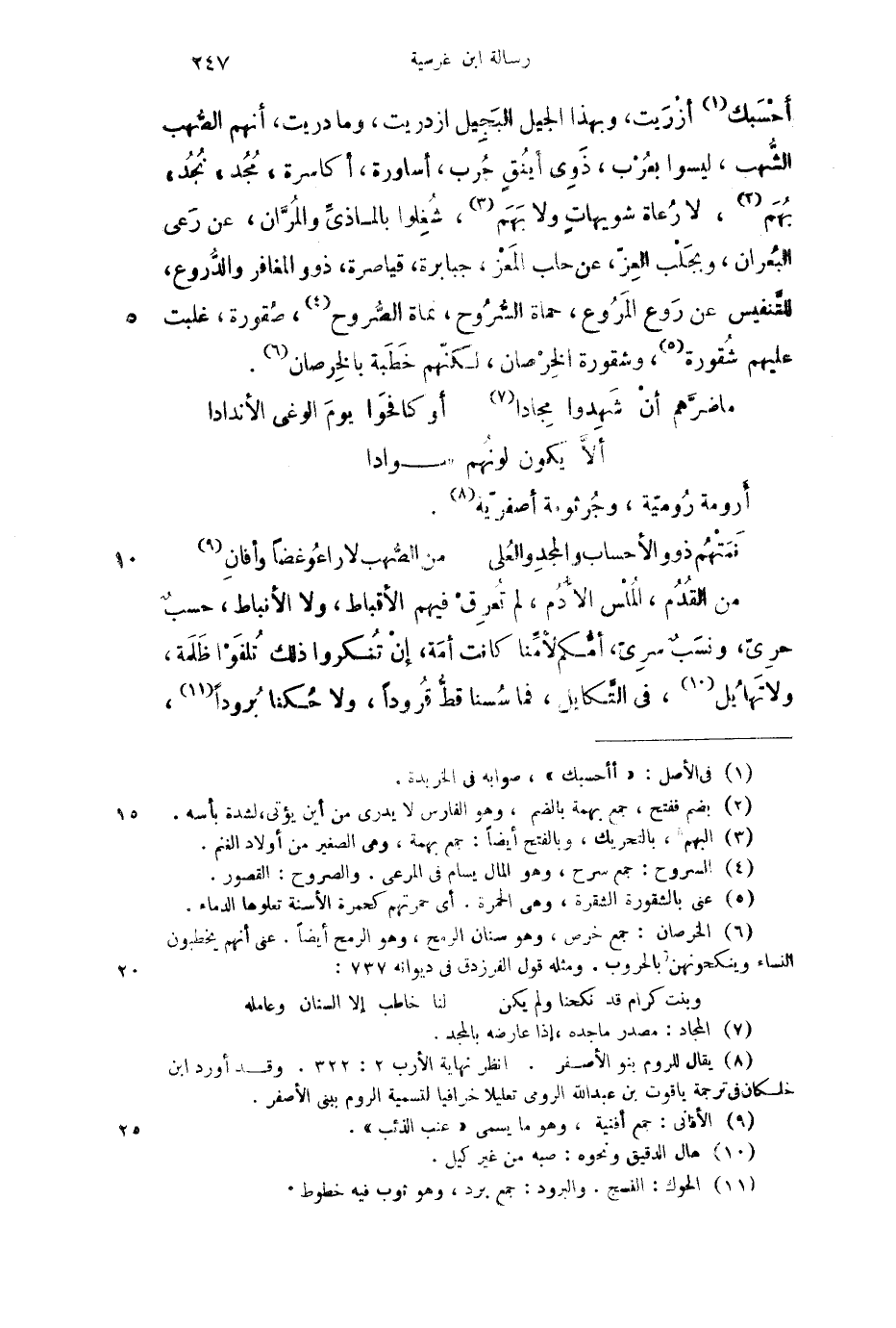 أحسبك أزريت، وبهذا الجيل البجيل ازدريت، وما دريت، أنهم الصهب الشهب، ليسوا بعرب، ذوي أنيق جرب، أساورة، أكاسرة، مجد، نجد، بهم، لا رعاة شويهات ولا بهم، شغلوا بالماذى والمران، عن رعي البعران، وبجلب العز، عن حلب المعز، جبابرة، قياصرة، ذوو المغافر والدروع، للتنفيس عن روع المروع، حماة السروح، نماة الصروح، صقورة، غلبت عليهم شقورة، وشقورة الخرصان، لكنهم خطبة بالخرصان.