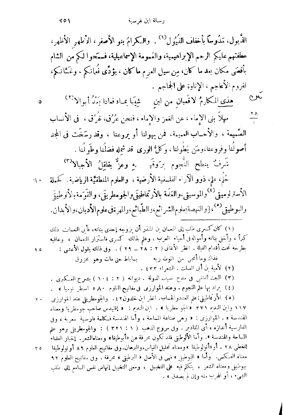 الذيول، مدوسا بأخفاف الفيول. والكرام بنو الأصفر، الأطهر الأظهر، عطفتهم عليكم الرحم الإبراهيمية، والعمومة الإسماعيلية، فسمحوا لكم من الشام بأقصى مكان بعد ما كان، من سيل العرم ما كان، يؤدي نعمانكم، وغسانكم، لقروم الأعاجم، الإتاوة على الجماجم.