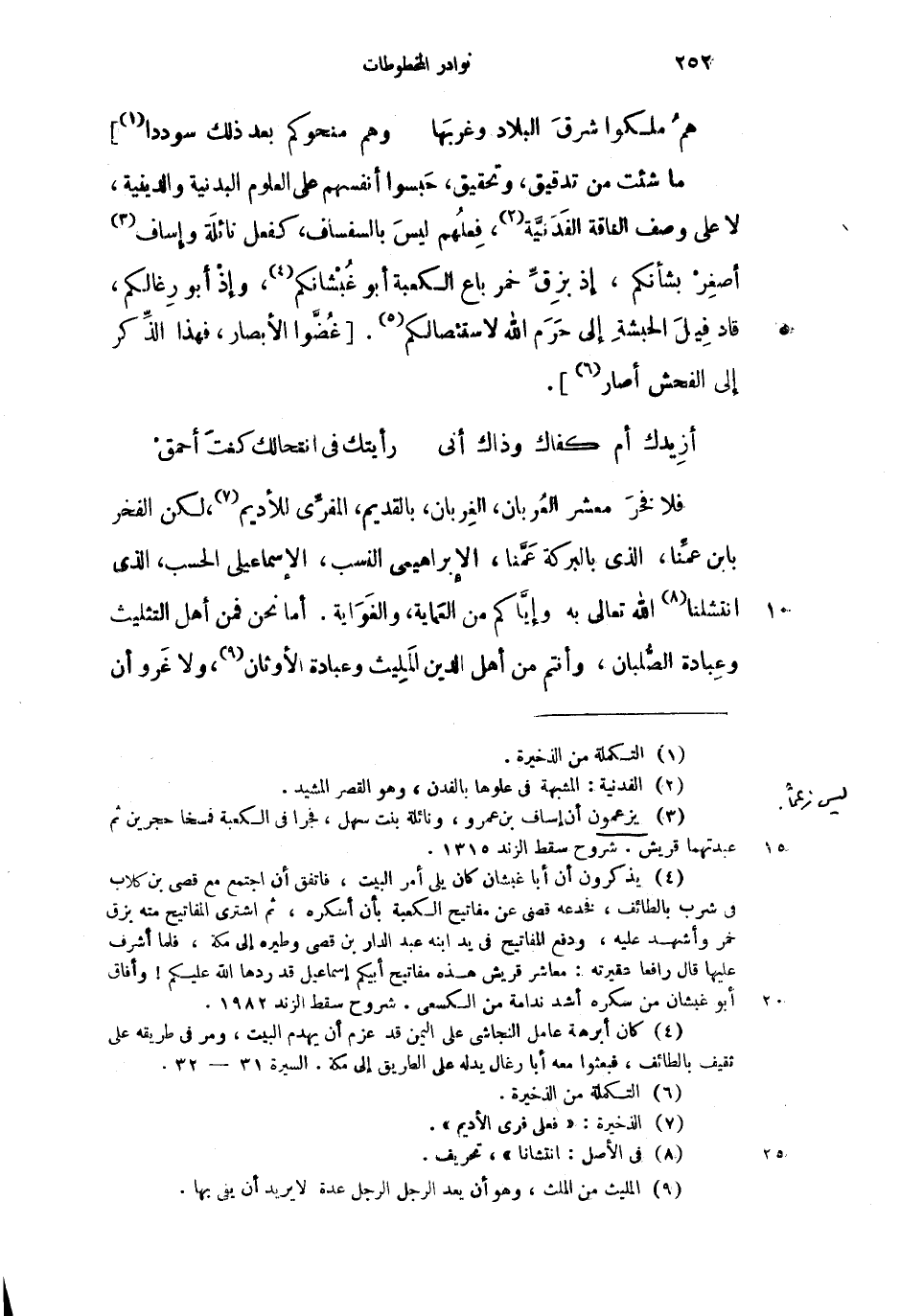 ما شئت من تدقيق، وتحقيق، حبسوا أنفاسهم على العلوم البدنية والدينية، لا على وصف الناقة الفدنية، فعلهم ليس بالسفساف، كفعل نائلة وإساف أصغر بشأنكم، إذ بزق خمر باع الكعبة أبو غبشانكم، وإذ أبو غالكم، قاد فيل الحبشة إلى حرم الله لاستئصالهم. [غضوا الأبصار، فهذا الذكر إلى الفحش أصار] .