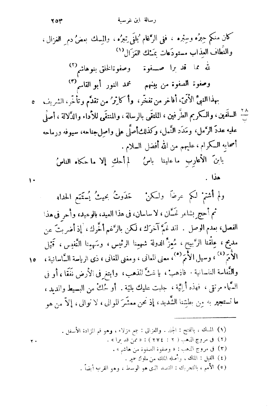 ثم أحج بشاعر غسان، لا ساسان، في هذا العيد، بالوعيد، وأحر في هذا الفصل، بعدم الوصل. لقد غم آخرك، لكن بالرغم أخرك، إذ أضربت عن مديح، علقنا الربيح، معز الدولة شهمنا الرئيس، وسهمنا النفيس، قيل الأمم، وسيل الأمم، معنى المعاني، ومغنى المغاني، ذي الرياسة الساسانية، والنفاسة النفسانية. فاذهب، يا غث المذهب، وابتغ في الأرض نفقا، أو في السماء مرتقى، فهذه ألية، جلبت عليك بلية. أو حك من البسيط والمديد، ما تستجير به من بطشنا الشديد، إذ نحن معشر الموالى، لا نوالى، إلا من هو