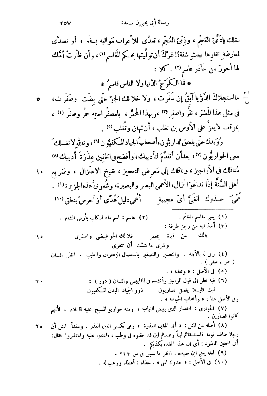 مثلك يا دميّ العجم، ودمي العجم، تعدى للأعراب مواليه بسفه، أو تصدى لمعارضة فخارها ببنت شفة؟! غرَّك أن توليتها بحكم المقاسم، وأن ظأرت أمك لها أحور من جآذر عاسم. كلا: