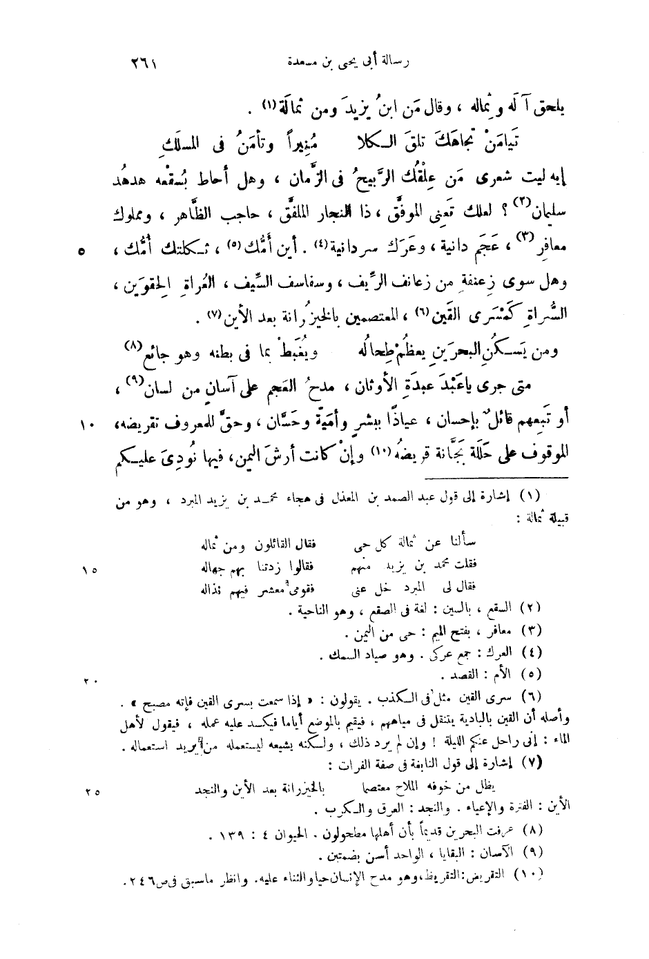 متى جرى، يا عبد عبدة الأوثان، مدح العجم على آسان من لسان، أو تبعهم قائل بإحسان، عياذاً ببشر وأمية وحسان، وحقَّ للمعروف تقريضه، الموقوف على حللة بجانة قريضه وإن كانت أرش اليمن، فيها نودي عليكم