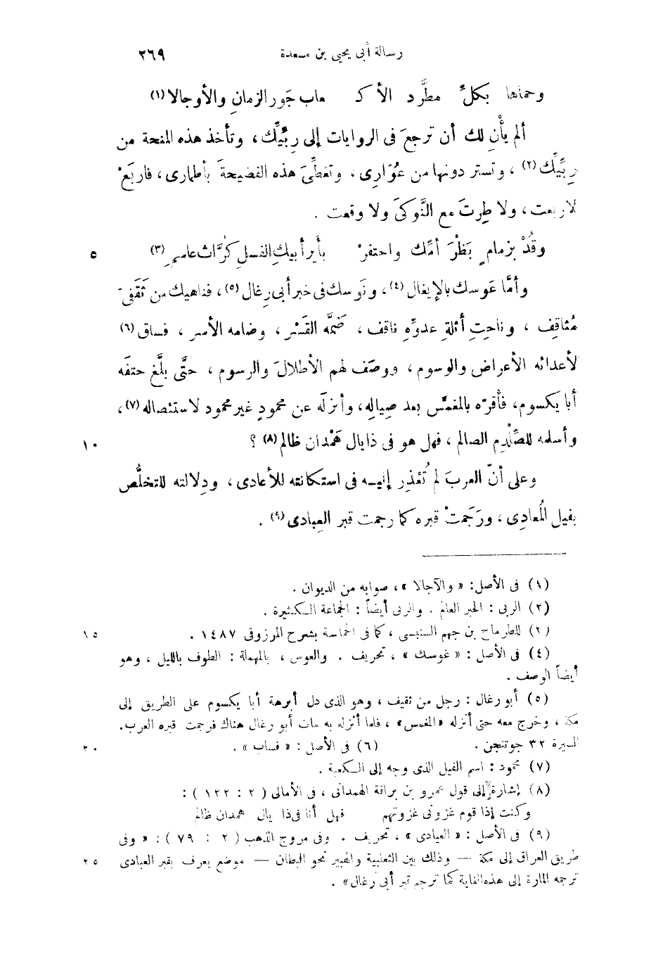 وأما عوسك بالأيغال، ونوسك في خبر أبي رغال، فناهيك من ثقفي مثاقف، وناحت أثلة عدوه ناقف، ضمه القسر، وضامه الأسر، فساق لأعدائه الأعراض والوسوم، ووصف لهم الأطلال والرسوم، حتى بلغ حتفه أبا يكسوم، فأقره بالمغمس بعد صياله، وأنزله عن محمود غير محمود لاستئصاله، وأسلمه للصلدم الصالم، فهل هو في ذايال همدان ظالم؟ وعلى أن العرب لم تعذر إليه في استكانته للأعادي، ودلالته للتخلص بفيل المعادى، ورجمت قبره كما رجمت قبر العبادى.