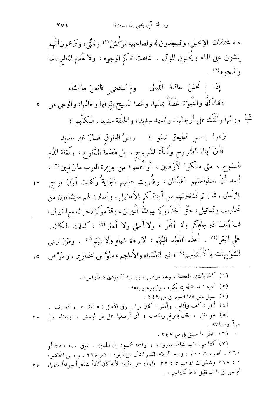 عنه مختلفات الإنجيل، وتسجدون له ولصاحبيه مرقش ومتى، وتزعمون أنهم يمشون على الماء ويحيون الموتى. شاهت تلكم الوجوه، ولا عدم اللطيم منها والمنجوه.